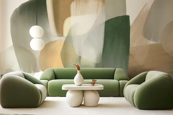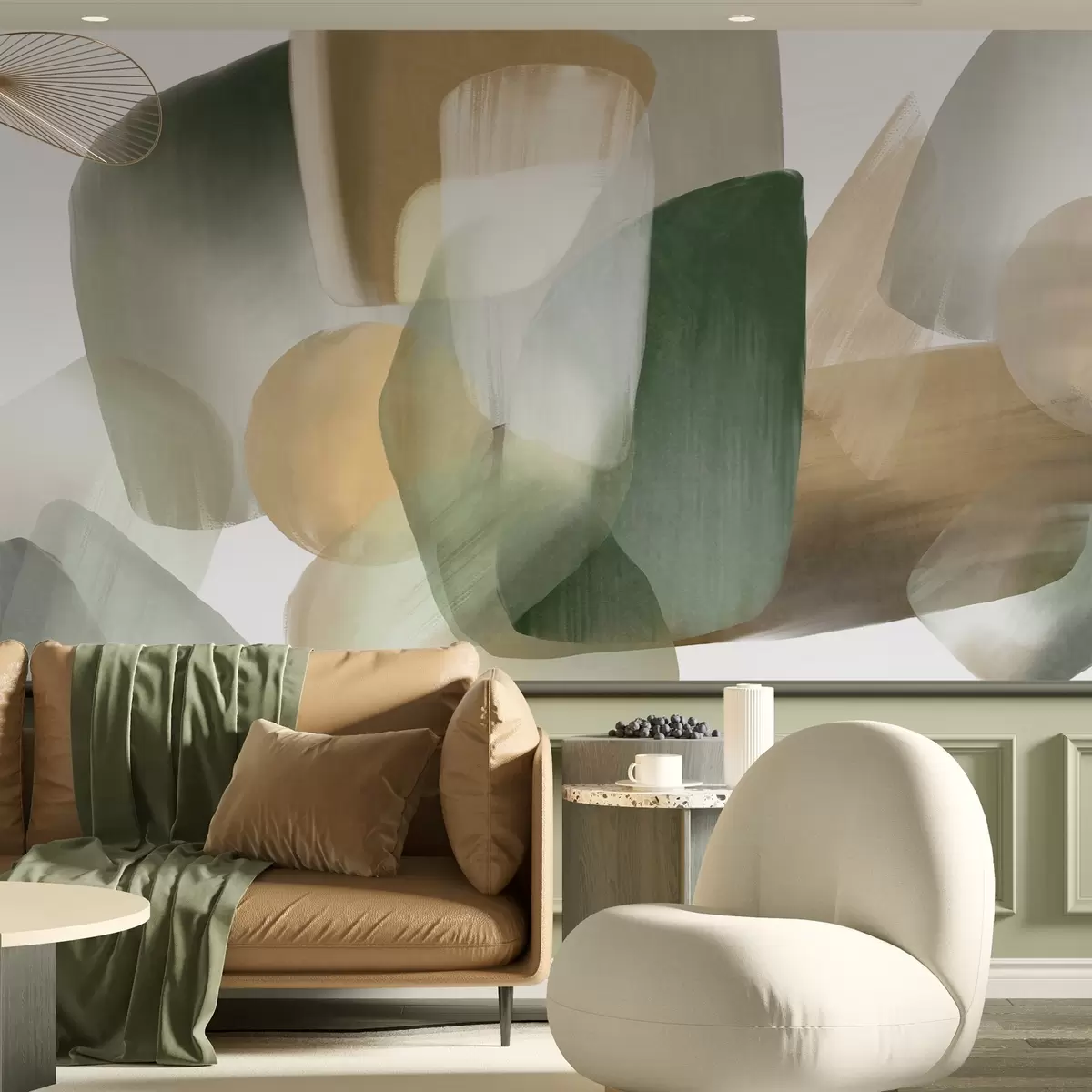 Fotomurales Formas abstractas con textura en colores verde y beige apagados, con bordes suaves y capas superpuestas. Nr. w09642