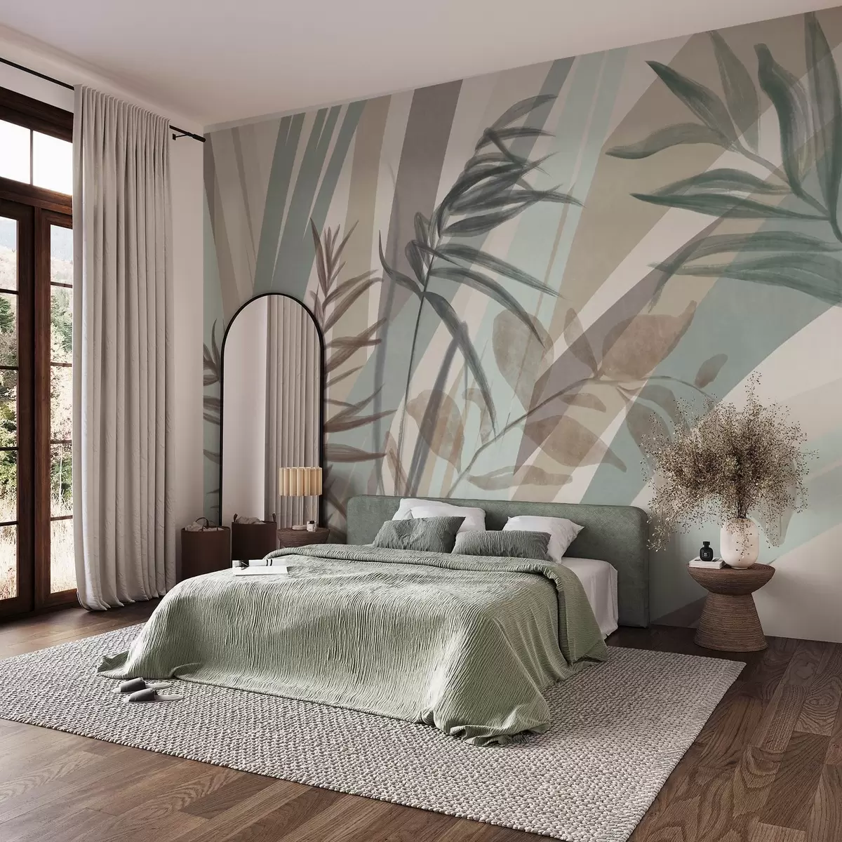 Fotomurales Hierba alta con textura y hojas en tonos tierra apagados, con líneas abstractas en el fondo, creando un estampado orgánico. Nr. w09643