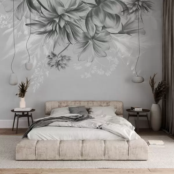 Fotomurales Flores y helechos texturizados en tonos gris oscuro y blanco sobre un fondo gris apagado, estilo de dibujo. Nr. w09644v1