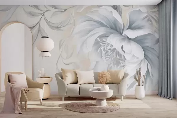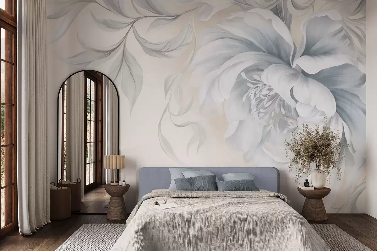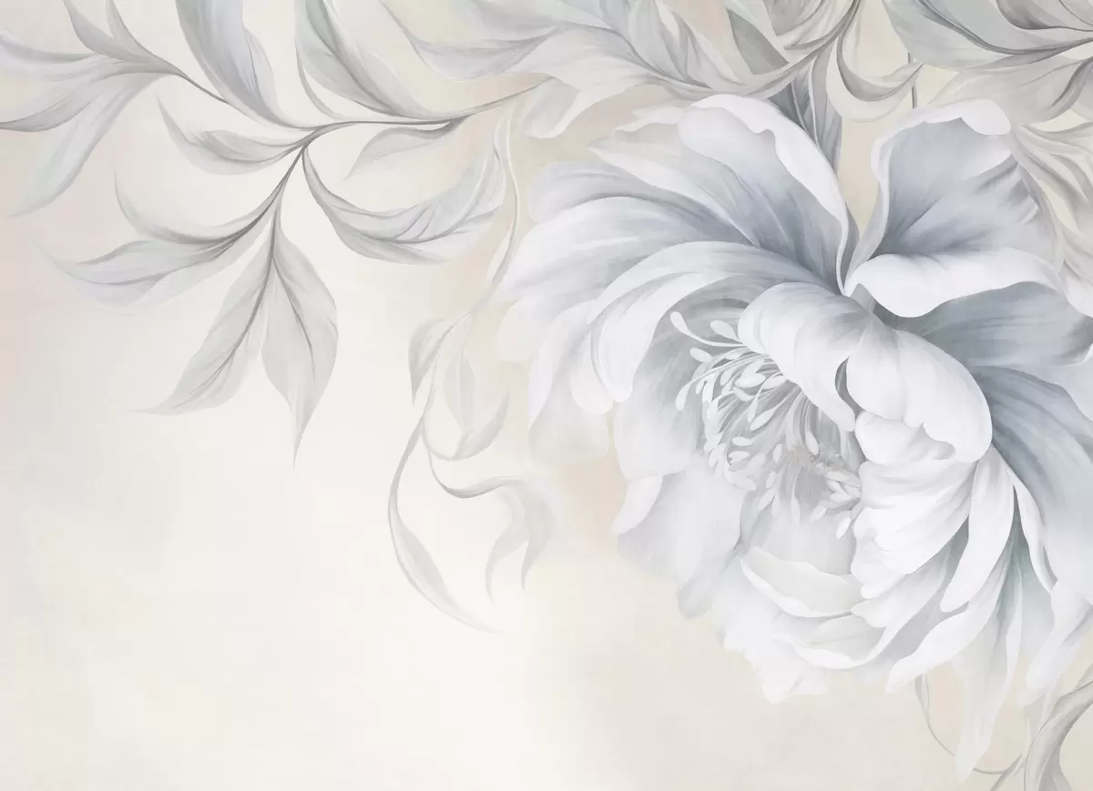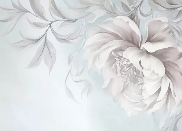 Fotomurales Peonía grande y con relieve, de pétalos delicados y hojas grises, pintada con un estilo suave Nr. w09647