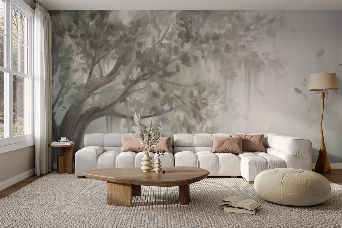 Fotomurales Árbol texturizado con hojas y ramas de color verde claro, con un fondo suave y difuminado. Nr. w09650