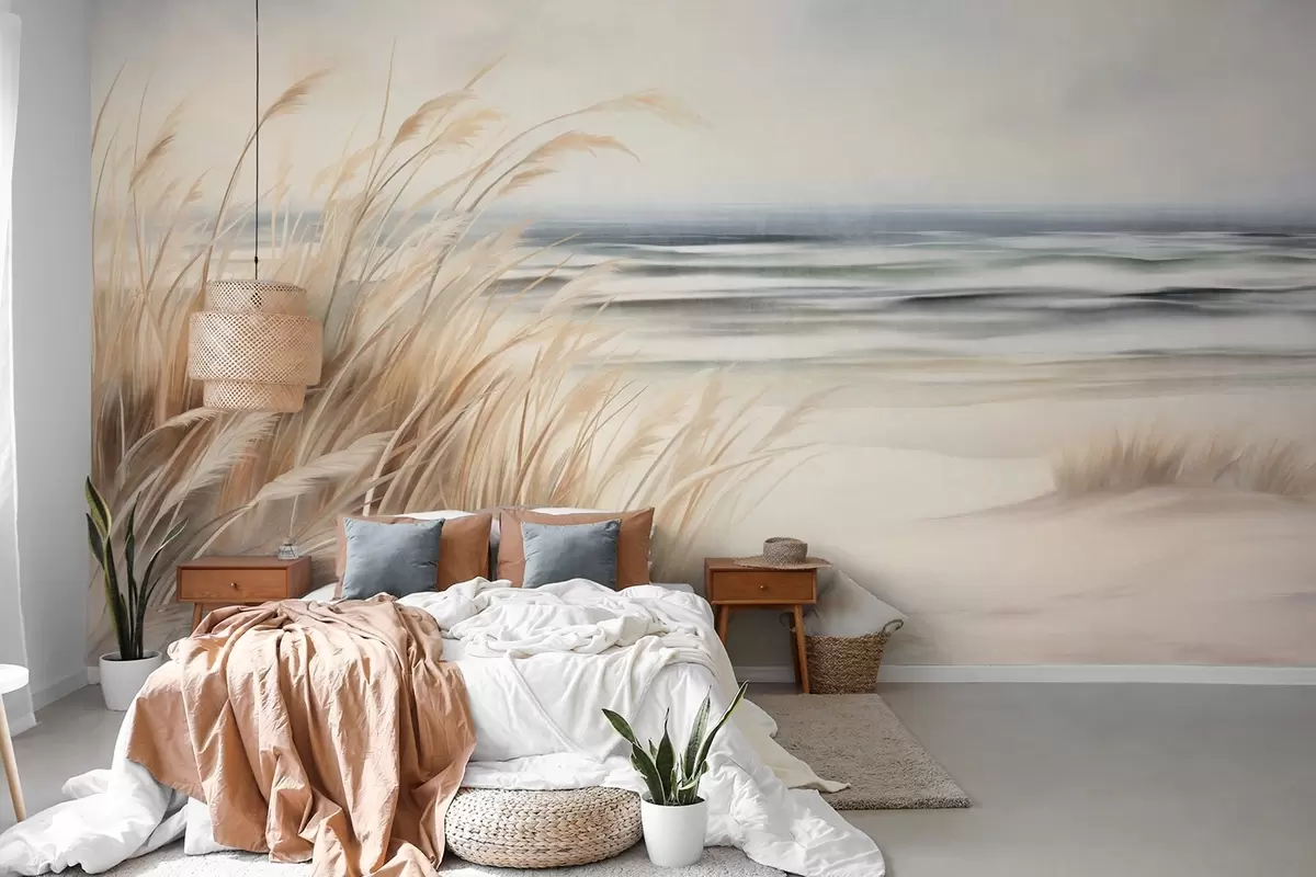 Fotomurales Paisaje con textura, con hierba seca en una playa de arena, con el océano y el cielo al fondo. Nr. w09739