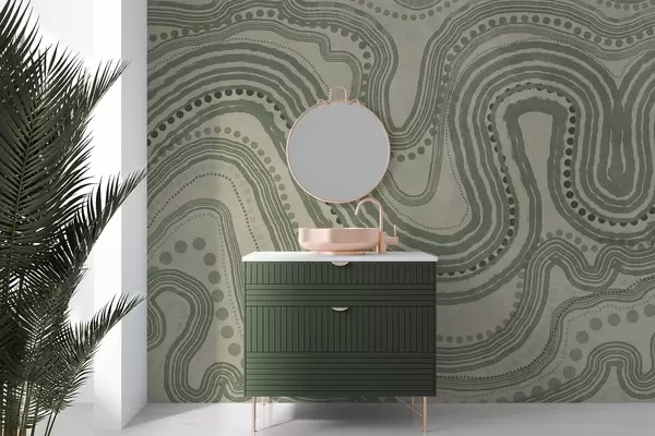 Fotomurales Líneas onduladas y puntos abstractos en verde y beige, arte moderno con textura. Nr. w09747