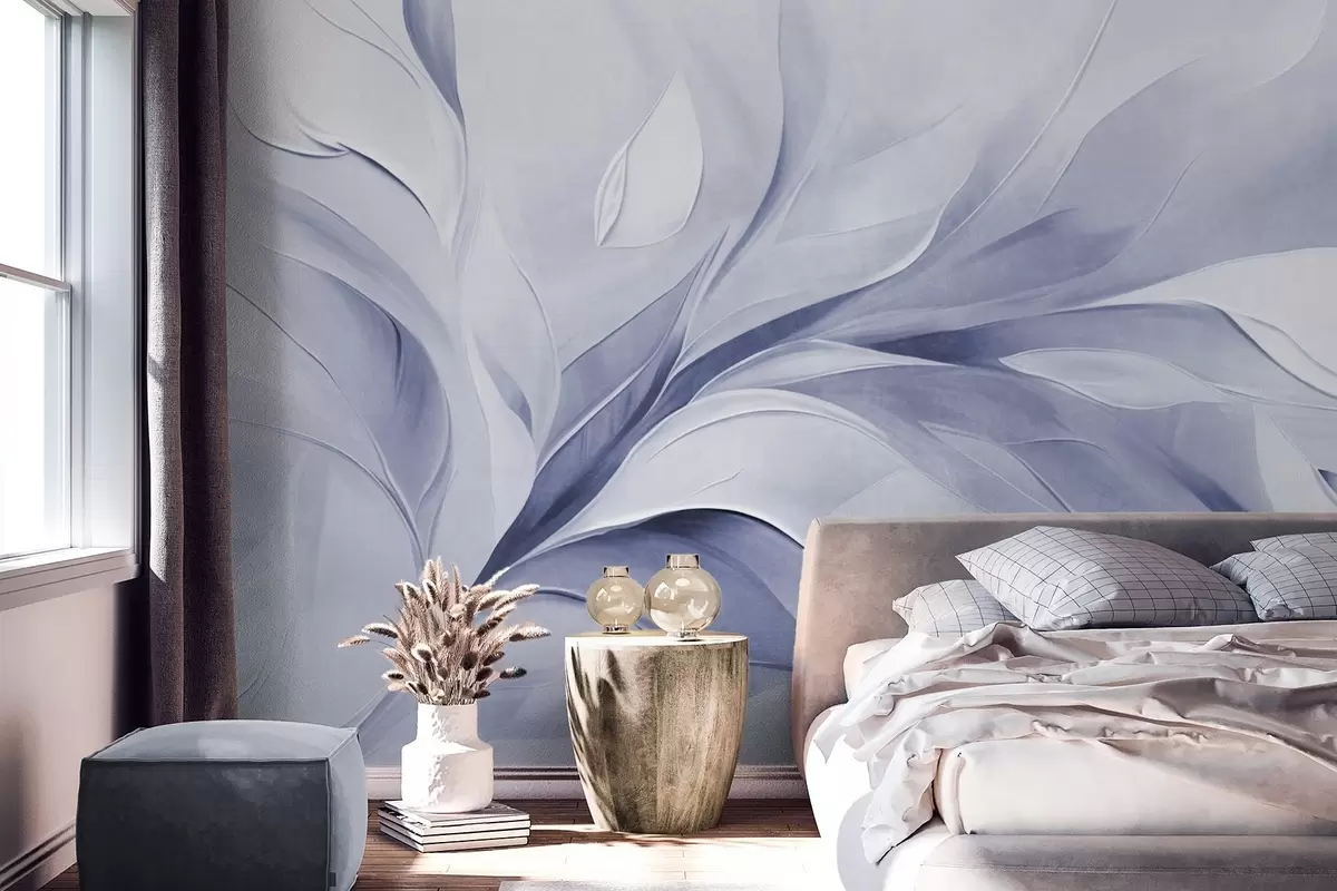 Fotomurales Estilo pictórico abstracto con textura de hojas fluidas en tonos azul pálido y blanco. Nr. w09765