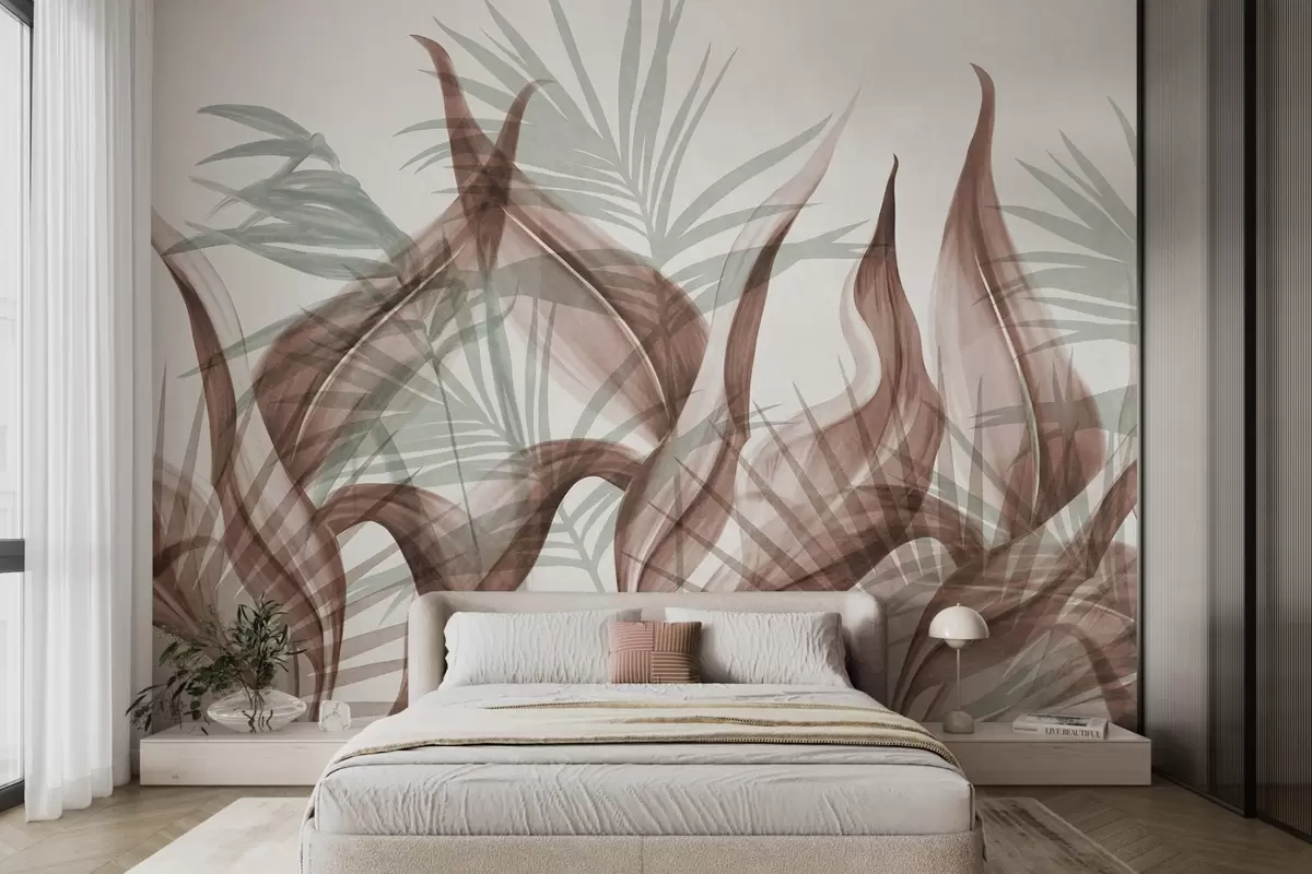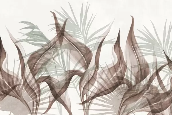 Fotomurales Hojas tropicales en tonos marrones y verdes sobre fondo blanco, estilo acuarela con textura. Nr. w09772