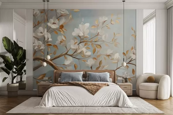 Fotomurales Rama de árbol con textura, flores blancas y hojas amarillas, estilo vintage Nr. w09814