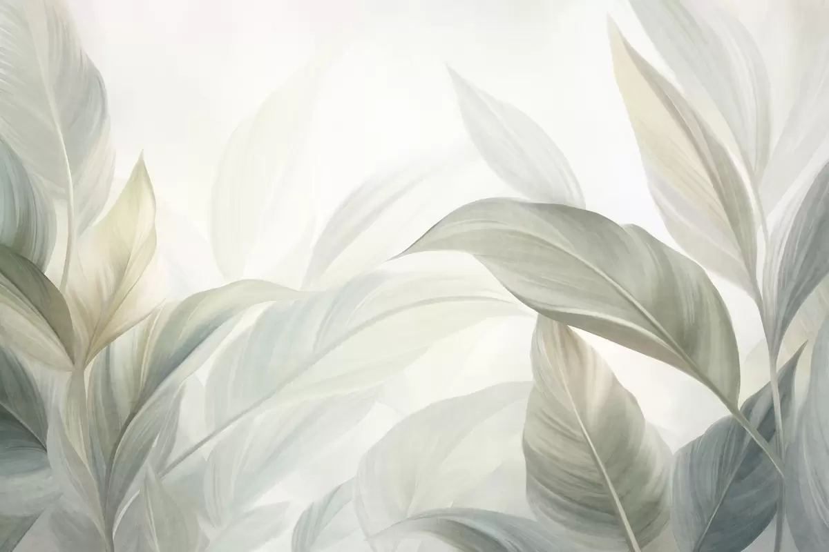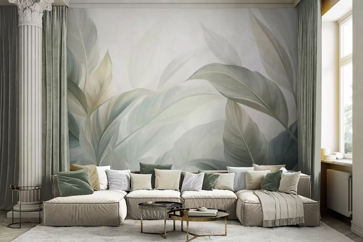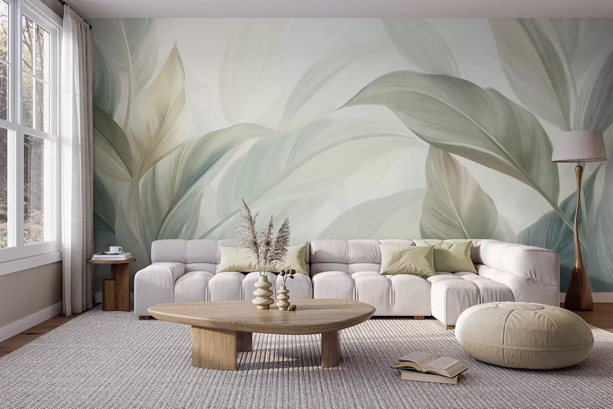 Fotomurales Hojas tropicales grandes de color verde pálido con tonos suaves y pasteles, obra de arte con textura Nr. w09816