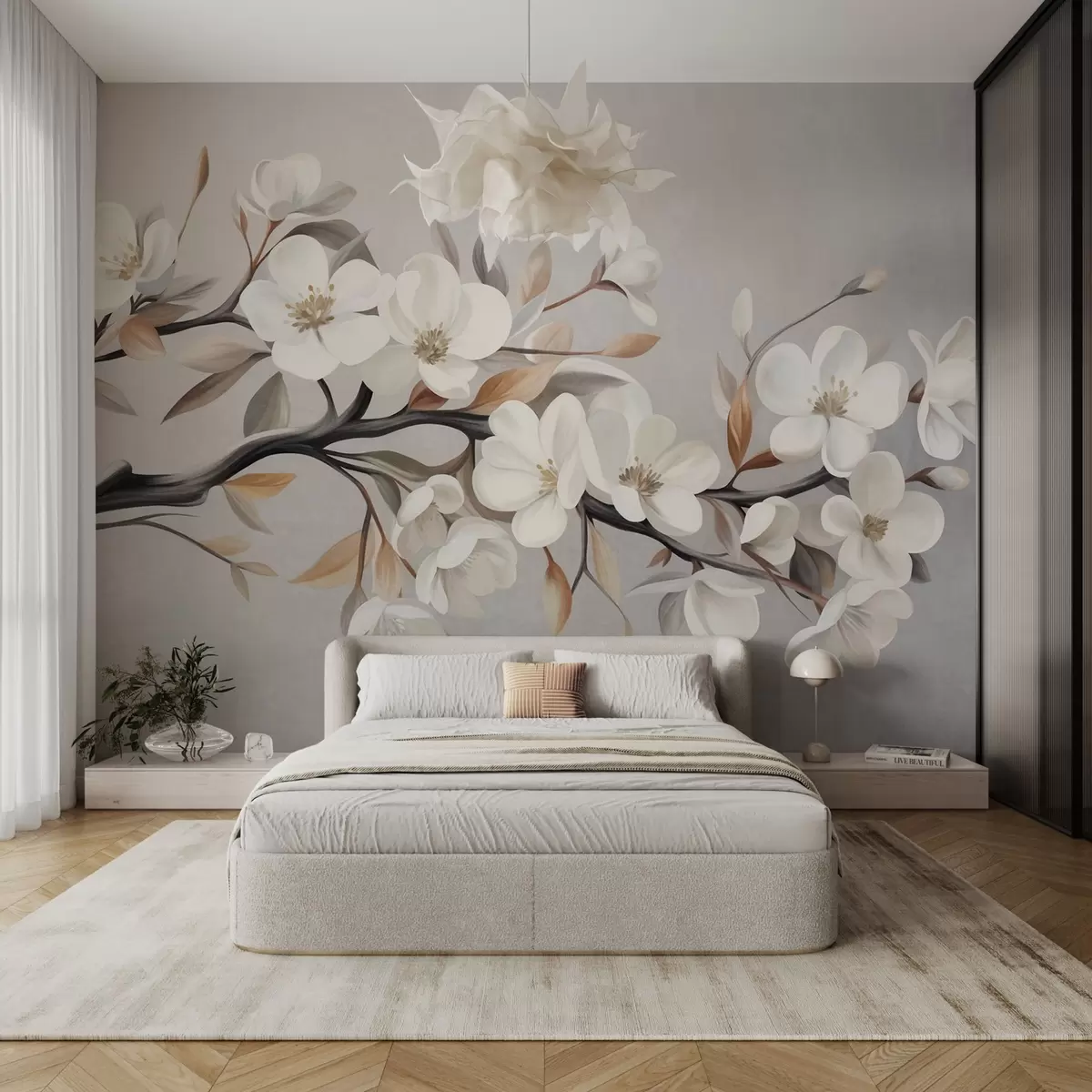 Fotomurales Rama con textura, con flores blancas y hojas marrones sobre un fondo gris claro Nr. w09817