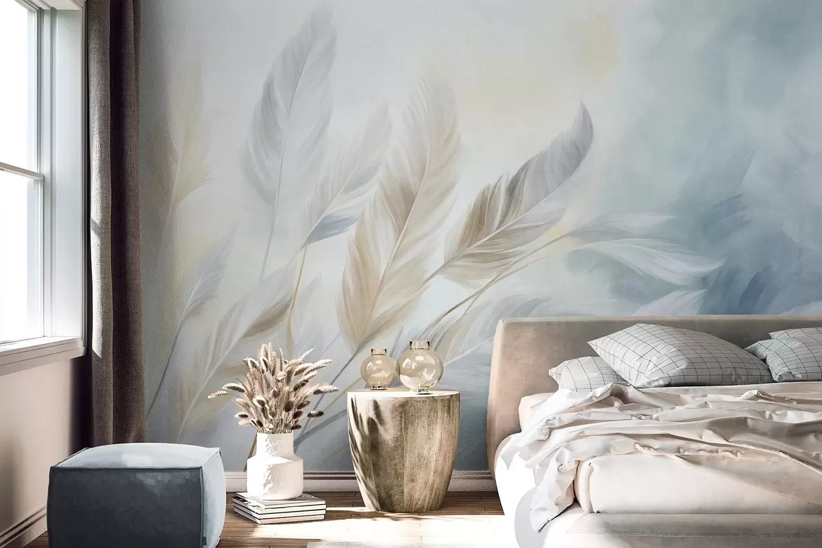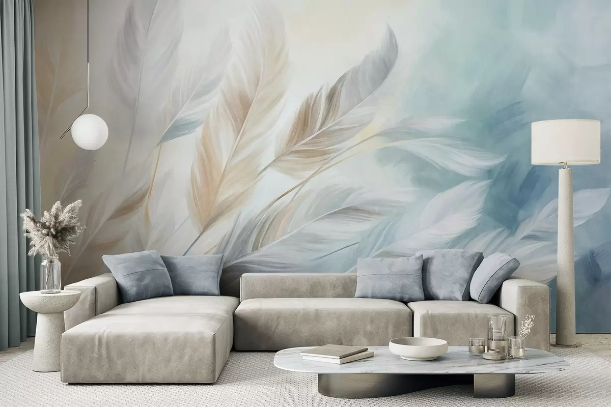 Fotomurales Plumas en tonos pastel con textura y bordes suaves y difuminados, sobre un fondo de estilo acuarela Nr. w09833