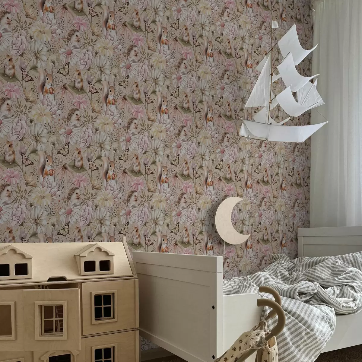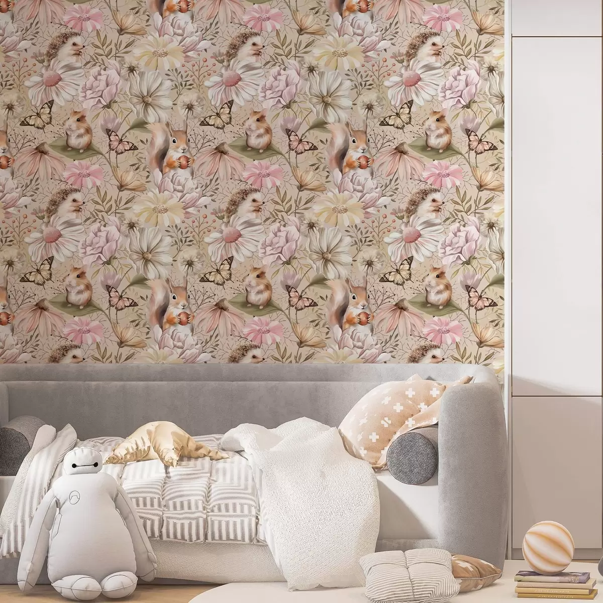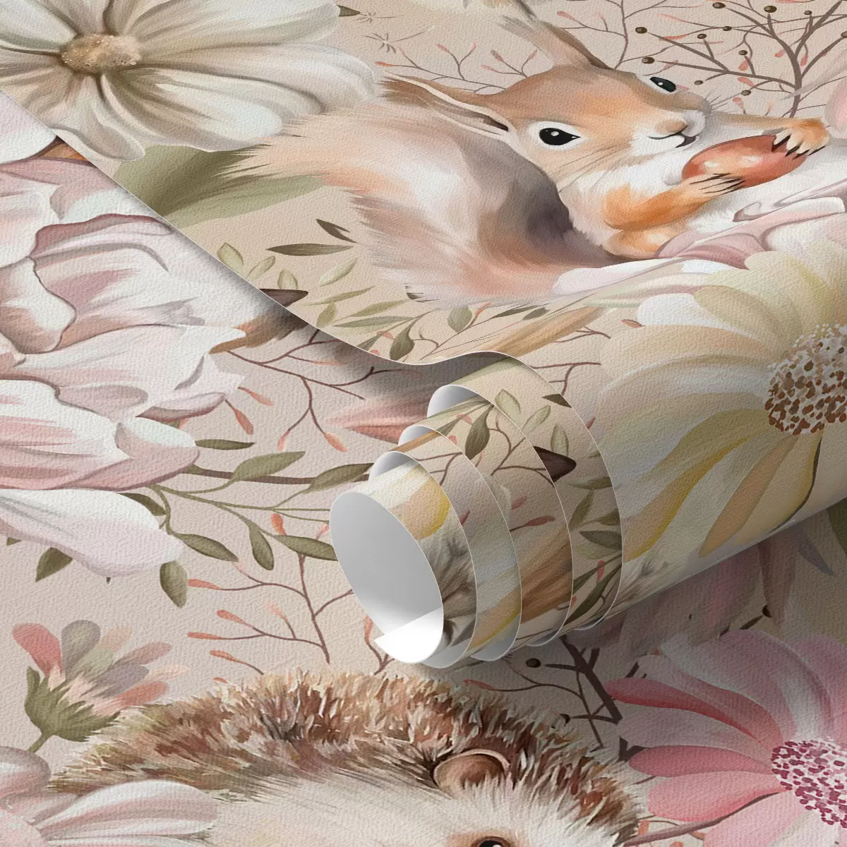 Papel pintado Simpático erizo, ardilla, hámster y mariposas con flores en colores pastel Nr. a00051