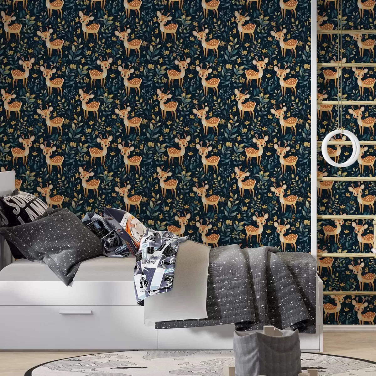 Papel pintado Cervatillo en un bosque oscuro con hojas amarillas Nr. a00124