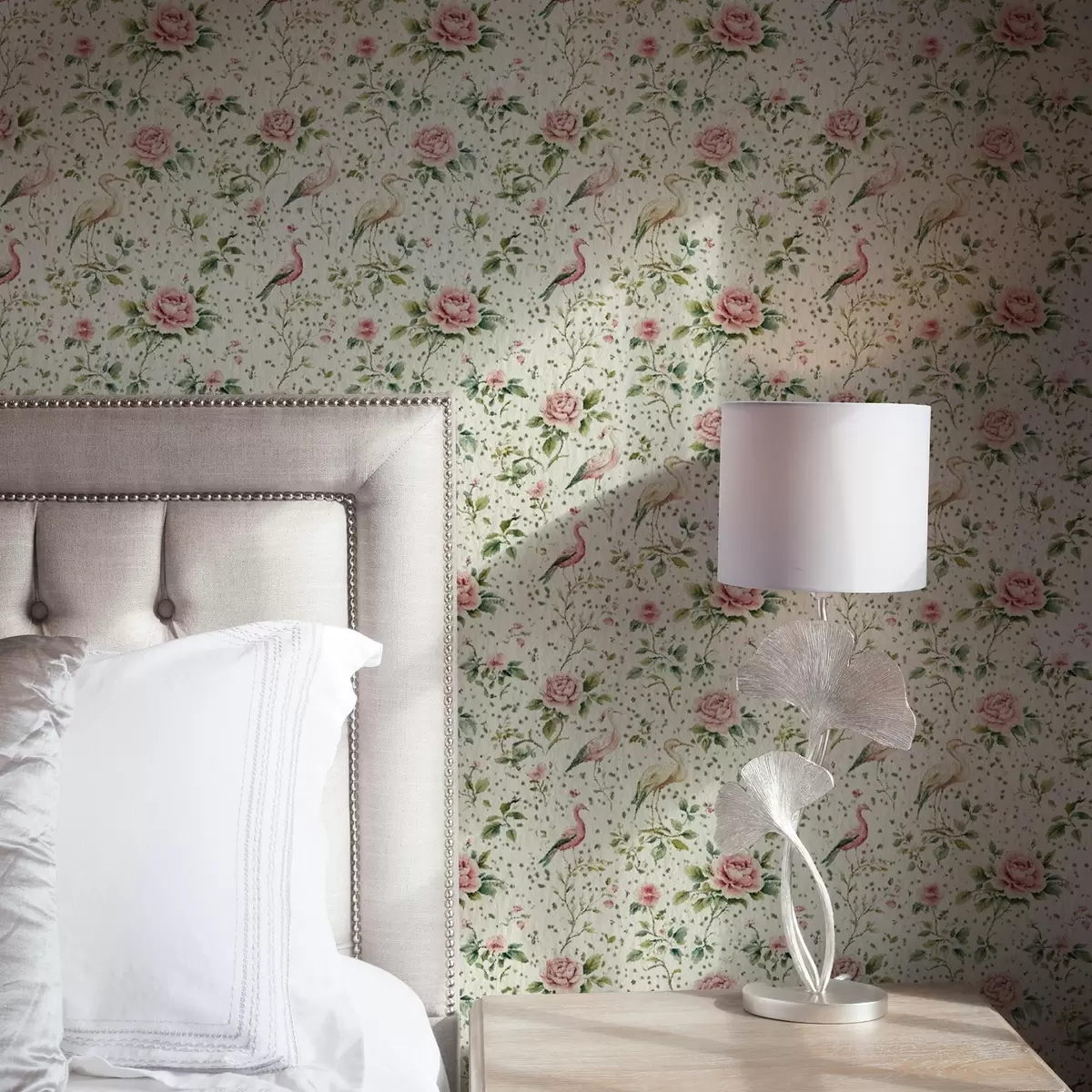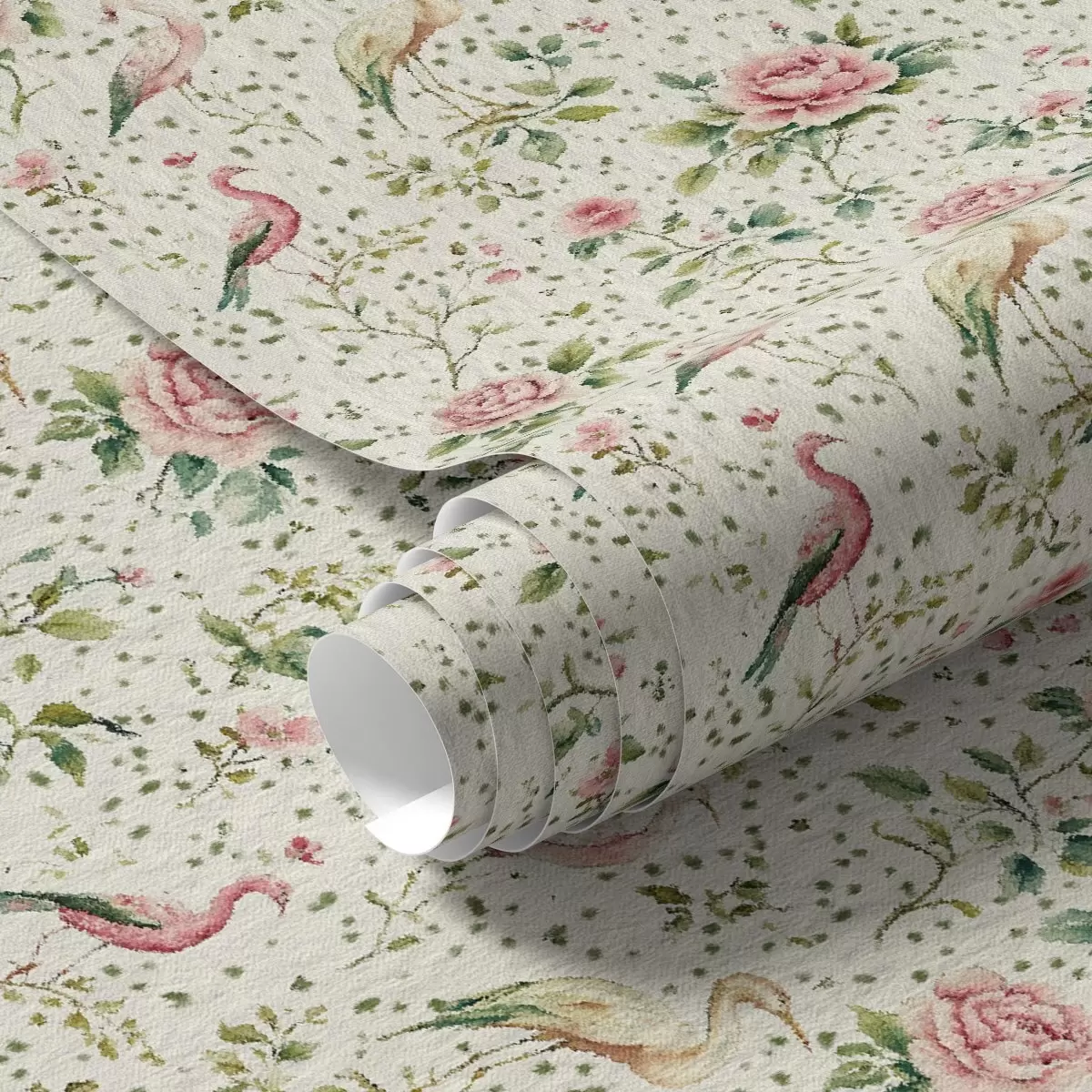 Papel pintado Rosas rosa pastel y pájaros en estilo shabby chic Nr. a00201
