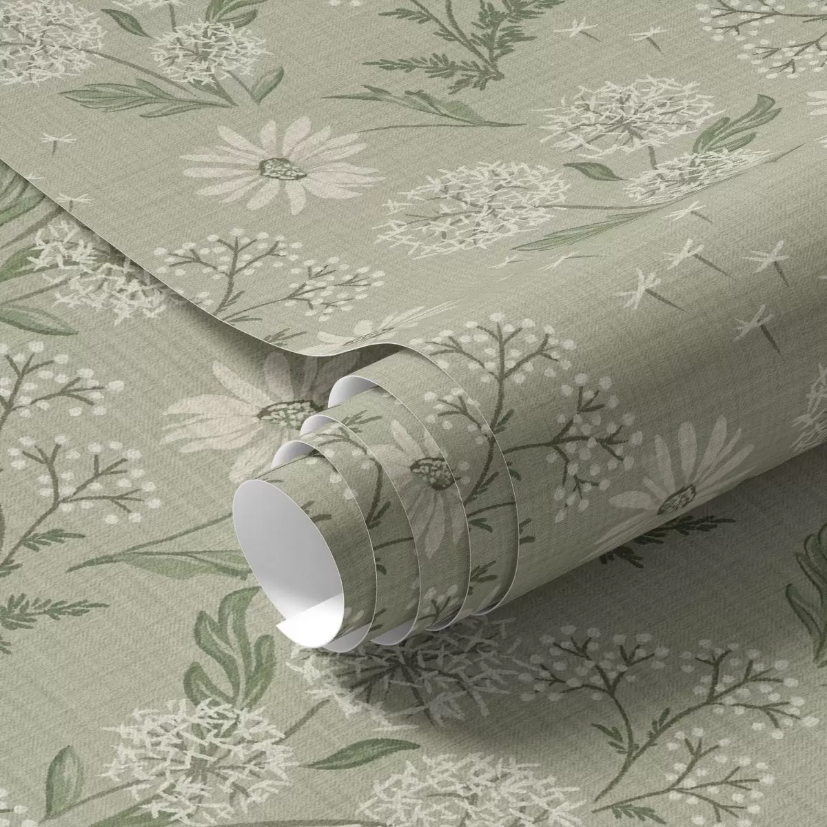 Papel pintado Dientes de león y margaritas, motivo botánico sobre fondo gris verdoso Nr. a00224