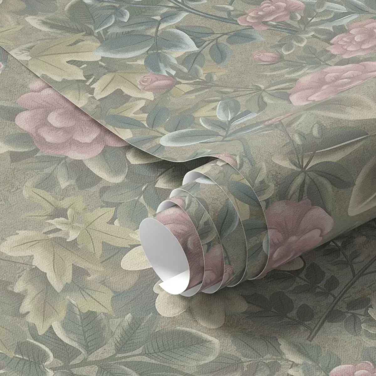 Papel pintado Flores y hojas rosas sobre fondo verde pastel Nr. a00306