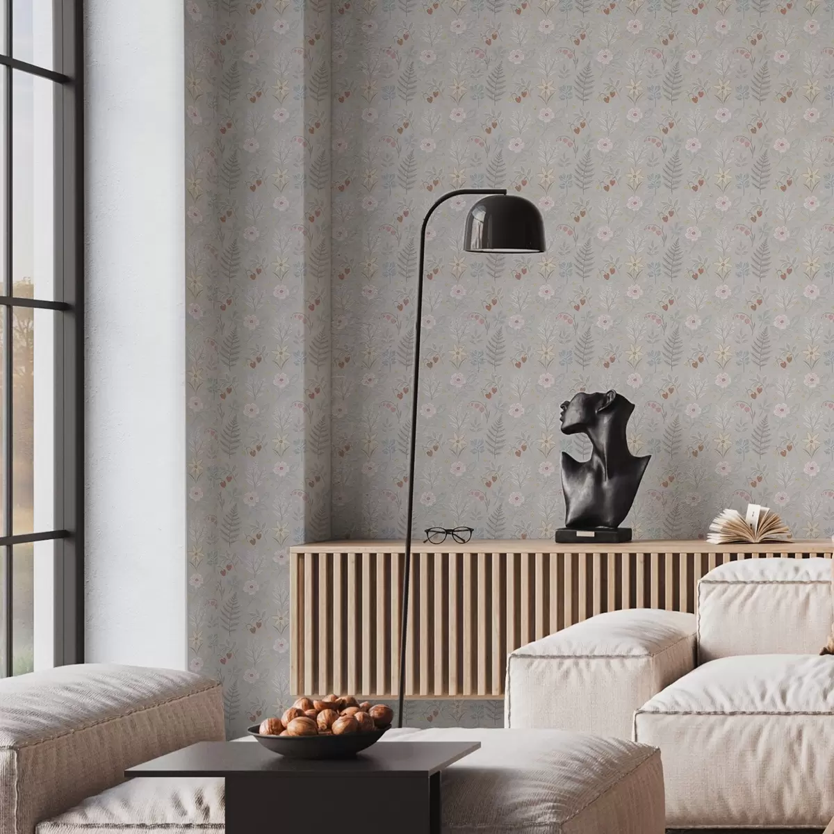 Papel pintado Flores y bayas pastel sobre fondo gris claro Nr. a00406