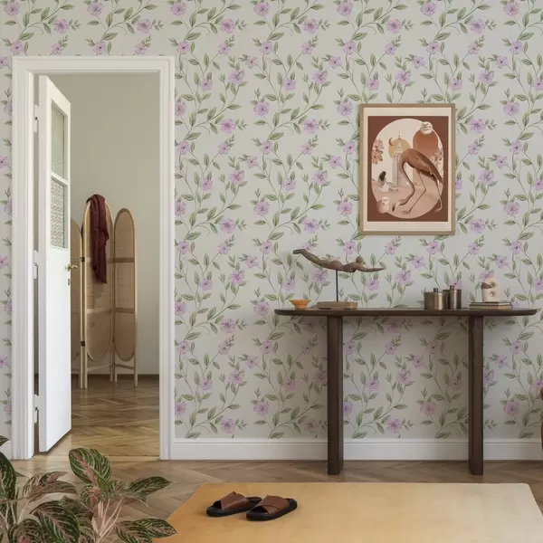 Papel pintado Flores rosas con enredaderas verdes sobre fondo crema Nr. a00453