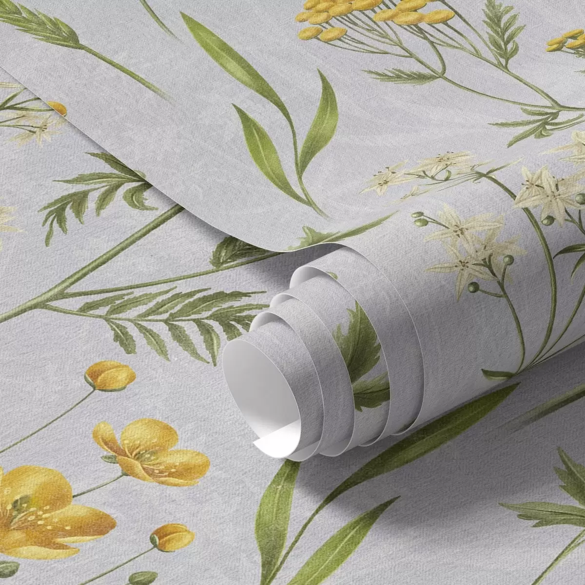 Papel pintado Flores amarillas y verdes sobre fondo gris claro Nr. a00472