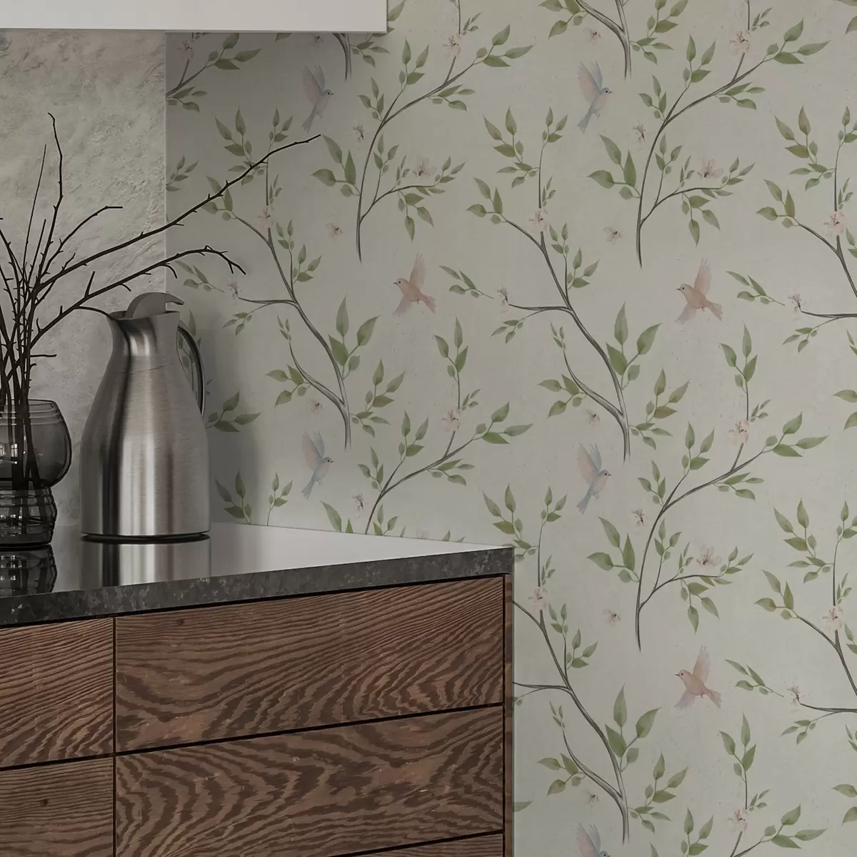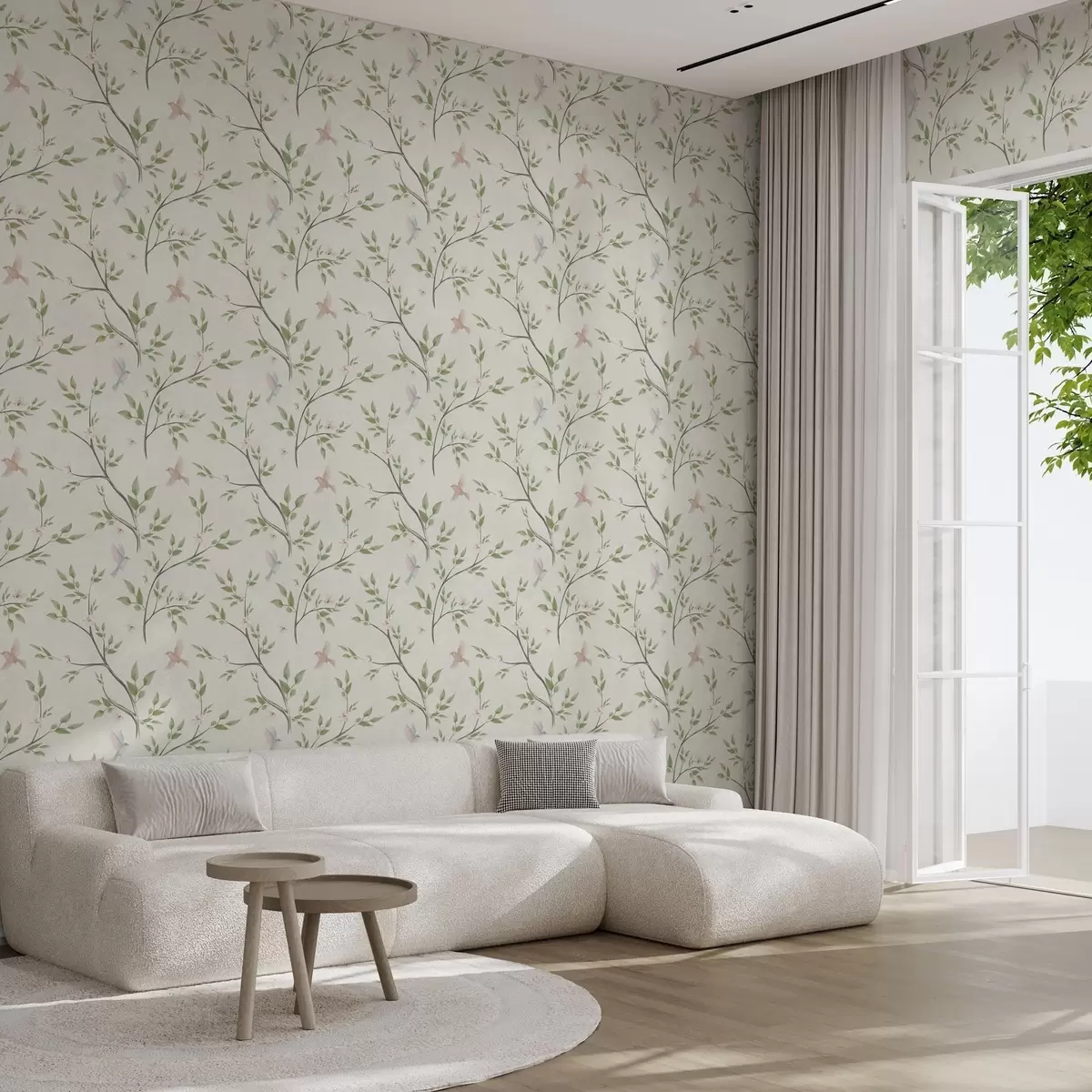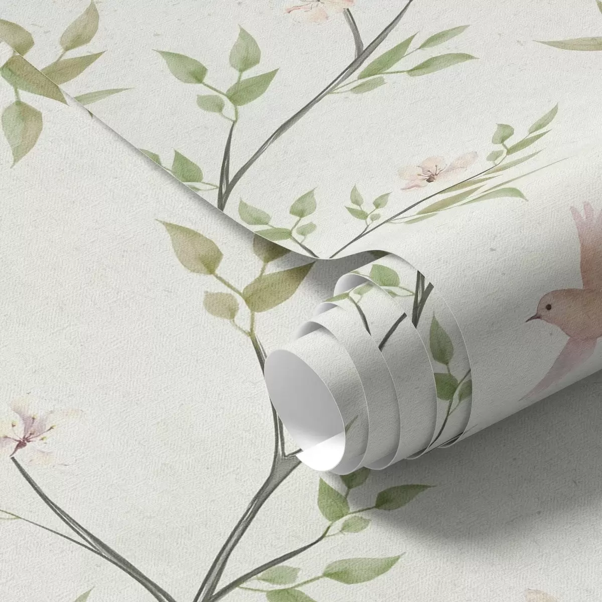 Papel pintado Ramas acuareladas con hojas y pájaros sobre un fondo claro Nr. a00496