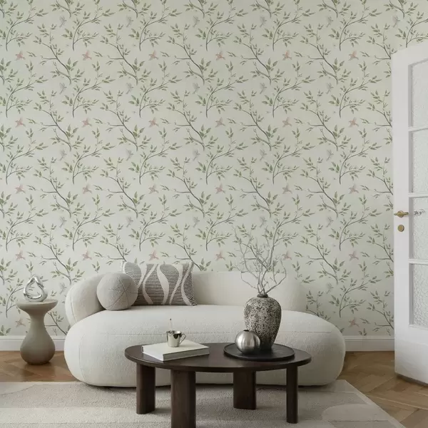 Papel pintado Ramas acuareladas con hojas y pájaros sobre un fondo claro Nr. a00496