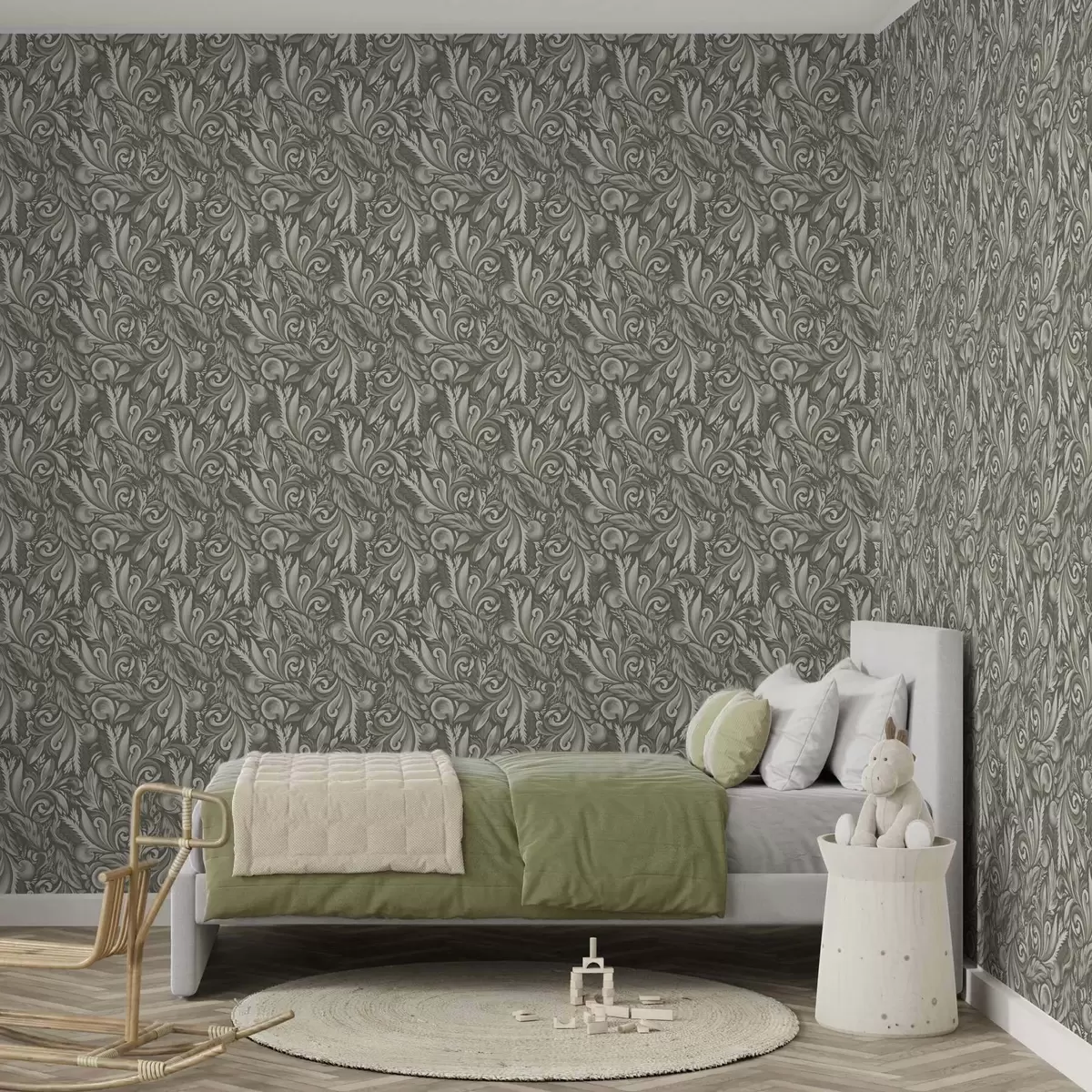 Papel pintado Volutas de acanto en una paleta de colores beige oliva Nr. a00501