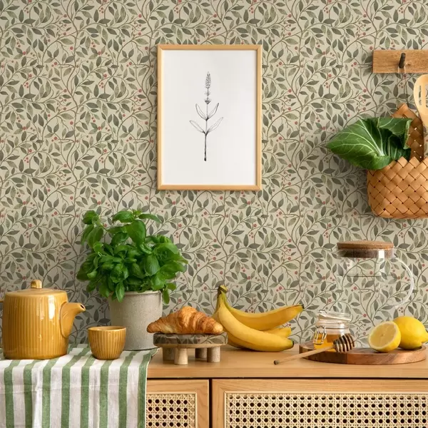 Papel pintado Ramas de olivo con bayas sobre un fondo cálido y claro Nr. a00573