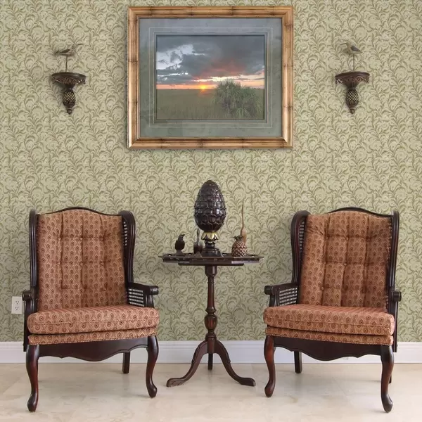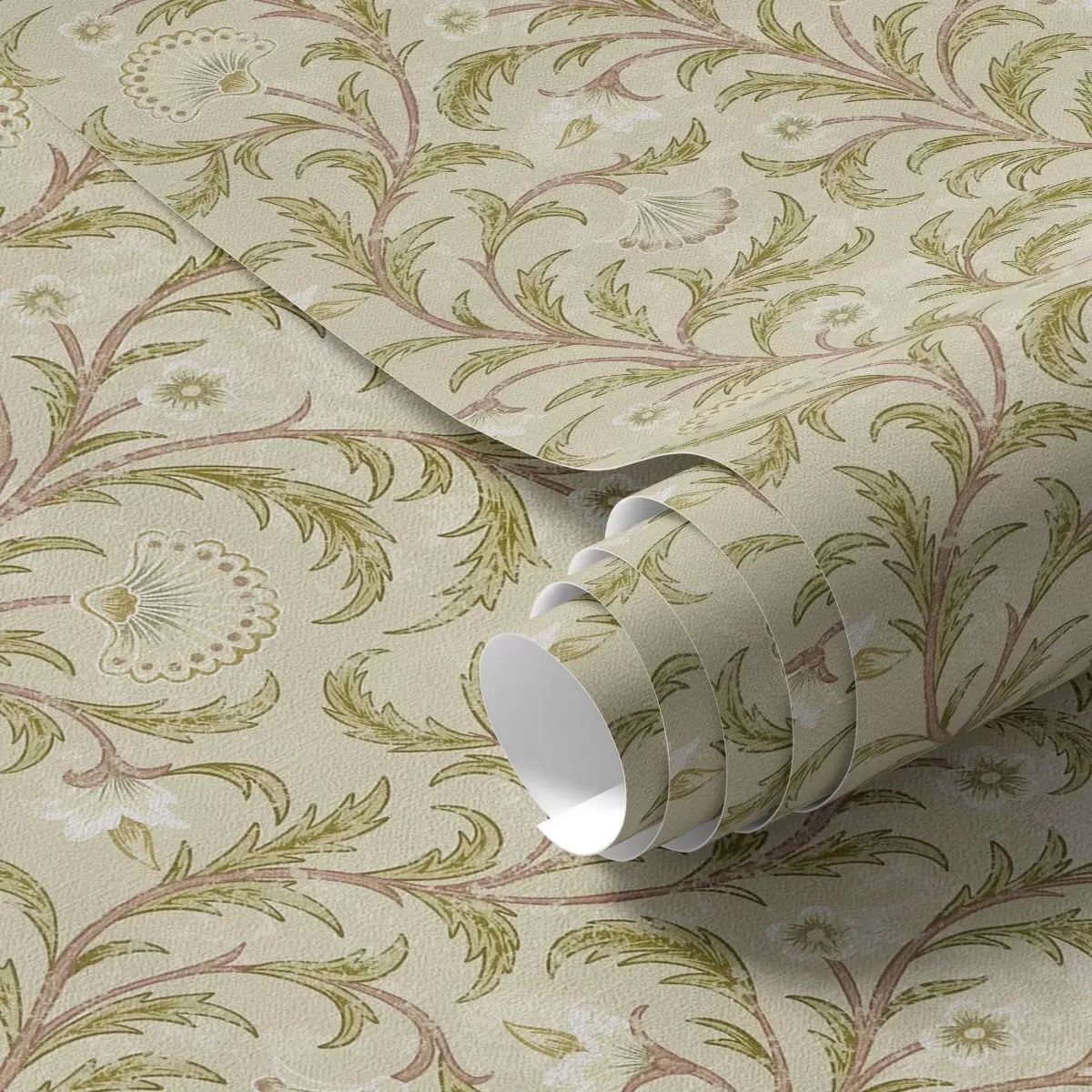 Papel pintado Adorno vintage con volutas y flores, beige y oliva Nr. a00574