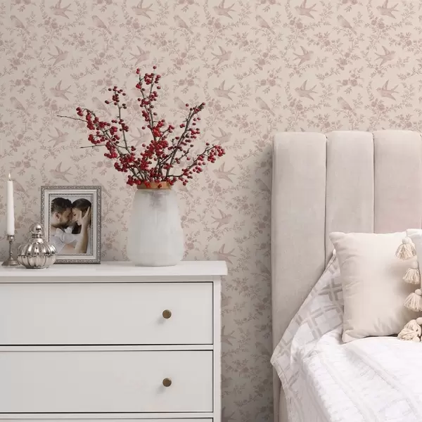 Papel pintado Pájaros y rosas, estampado vintage en rosa empolvado Nr. a00587