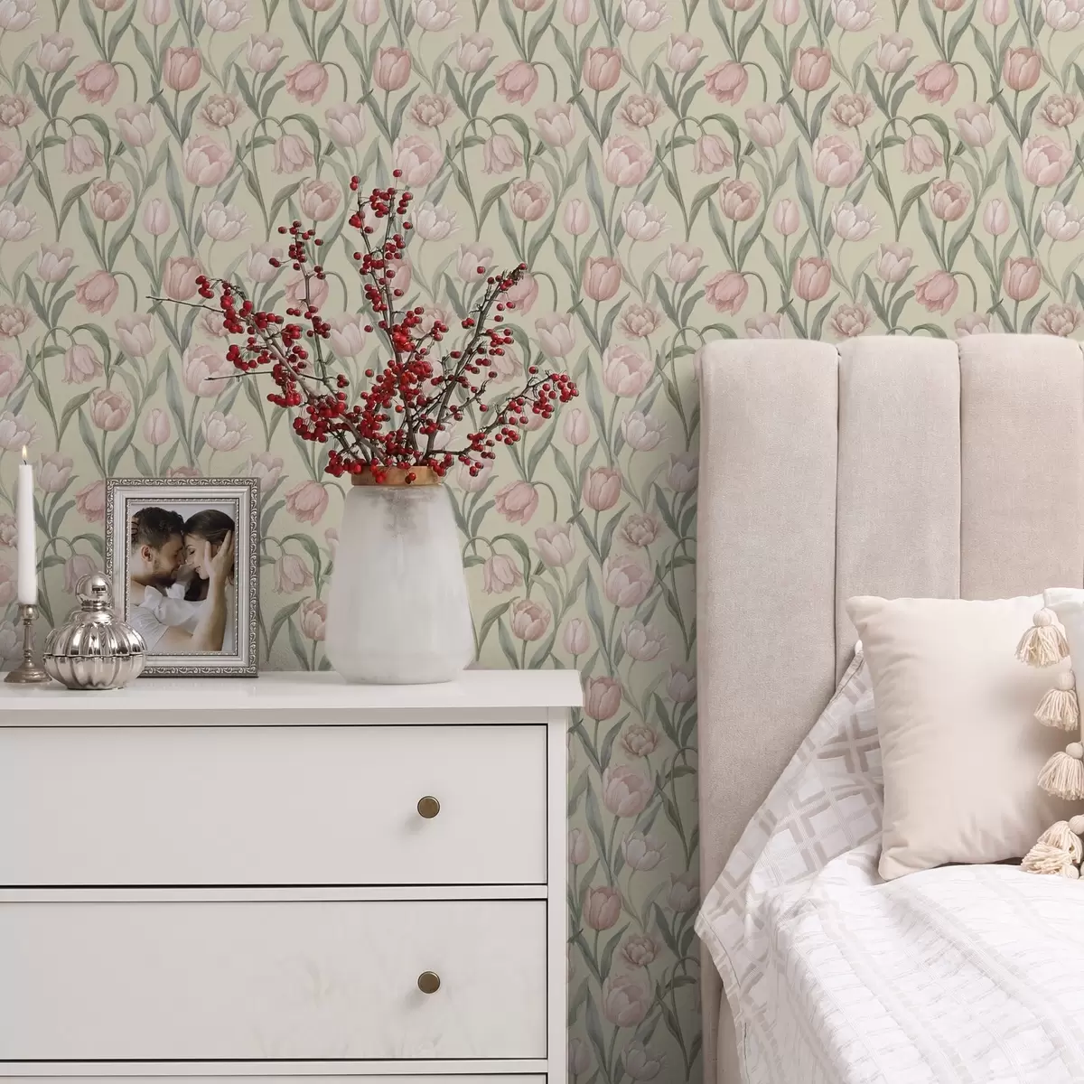 Papel pintado Tulipanes rosa pálido sobre un suave fondo beige Nr. a00589