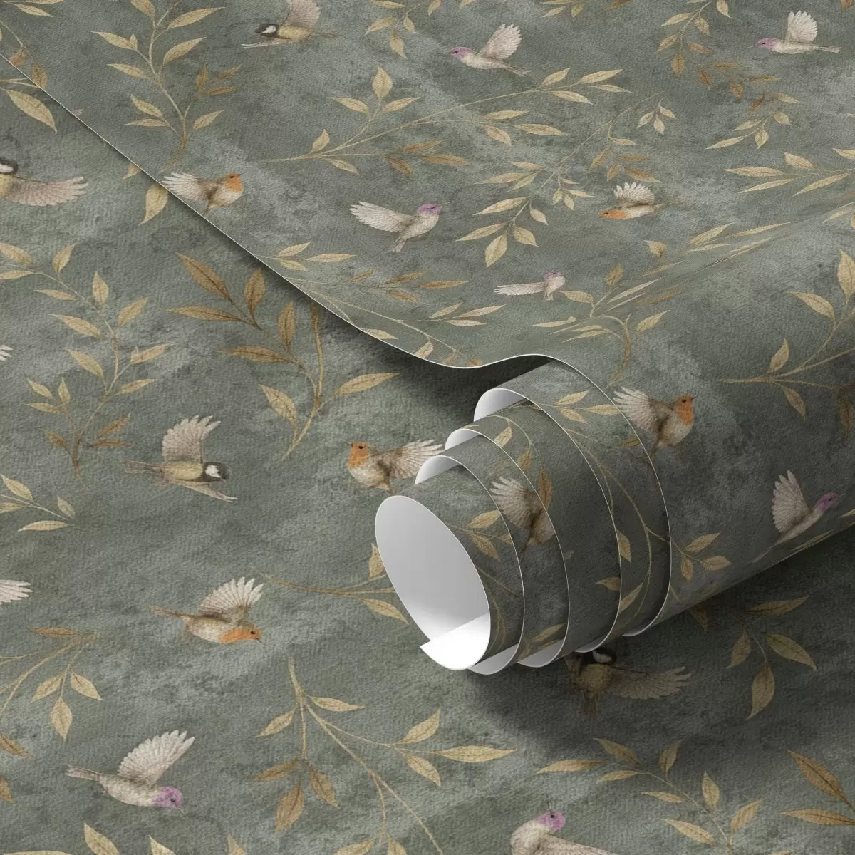 Papel pintado Pájaros entre follaje naranja sobre un fondo verde intenso Nr. a00591