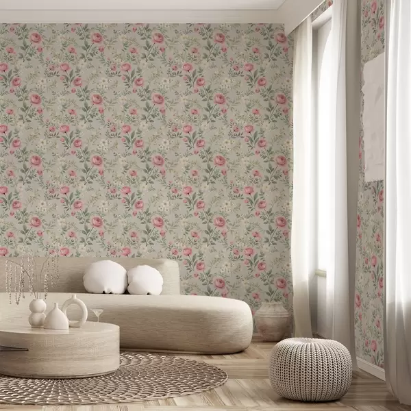 Papel pintado Peonías y flores blancas en acuarela sobre fondo gris-beige Nr. a00592