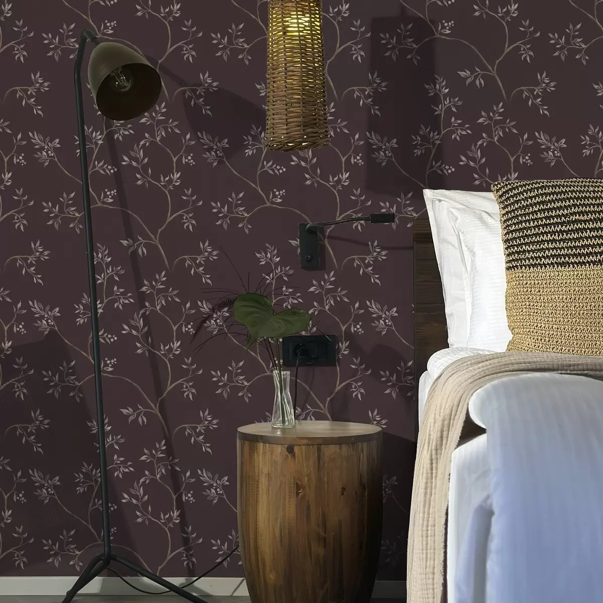 Papel pintado Delicadas ramas frondosas sobre un rico fondo ciruela Nr. a00597v2