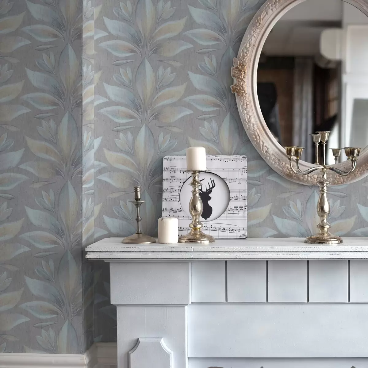 Papel pintado Grandes hojas estilizadas en una paleta de colores azul arena sobre fondo gris Nr. a00601