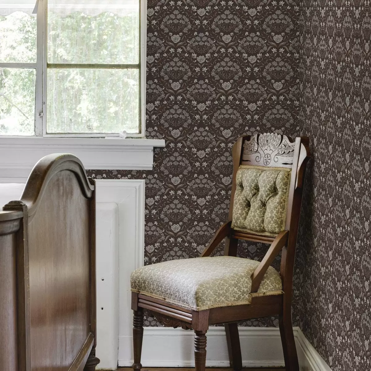 Papel pintado Damasco de chocolate negro con peonías y campanillas de invierno Nr. a00603v2