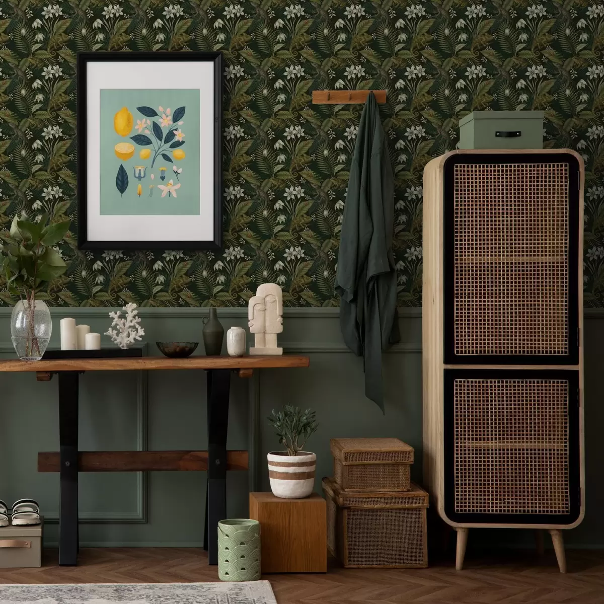 Papel pintado Camaleones y hojas tropicales, flores blancas, fondo oscuro Nr. a00608v1