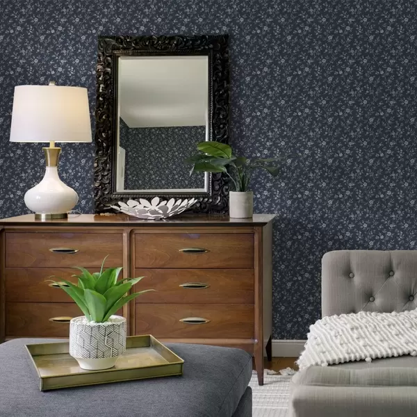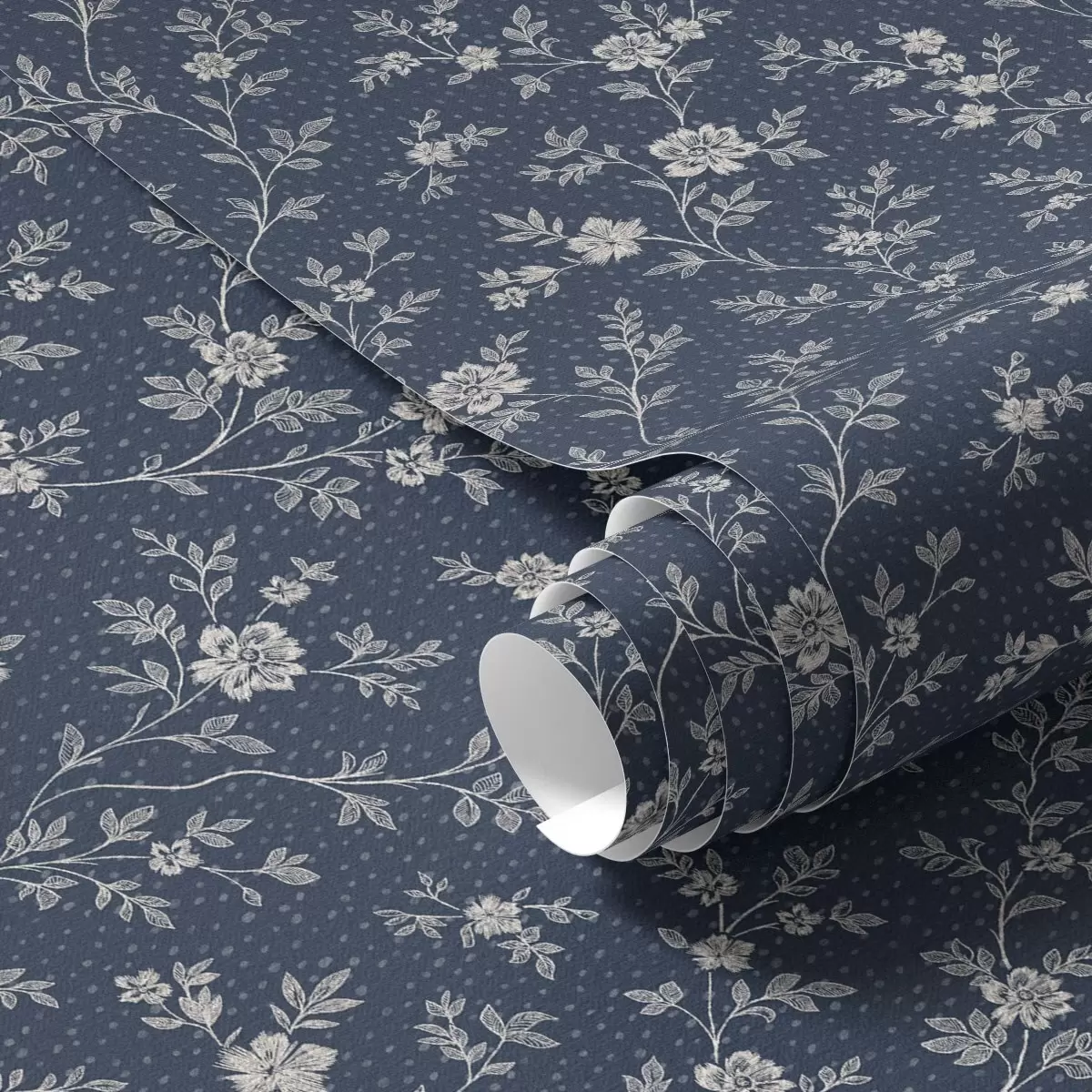 Papel pintado Fondo azul marino oscuro con finas ramas y flores de color beige Nr. a00612