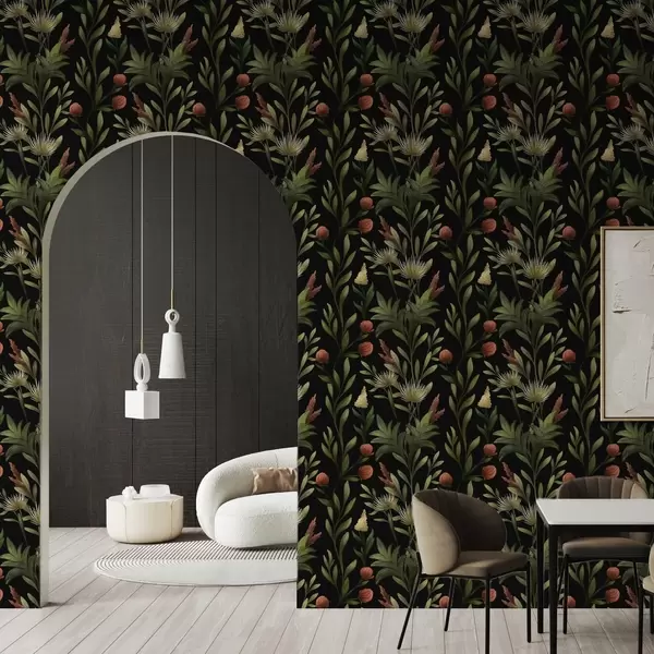 Papel pintado Hierbas altas y flores sobre fondo negro, estampado detallado Nr. a00620