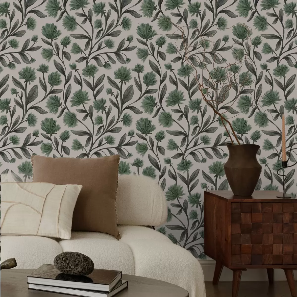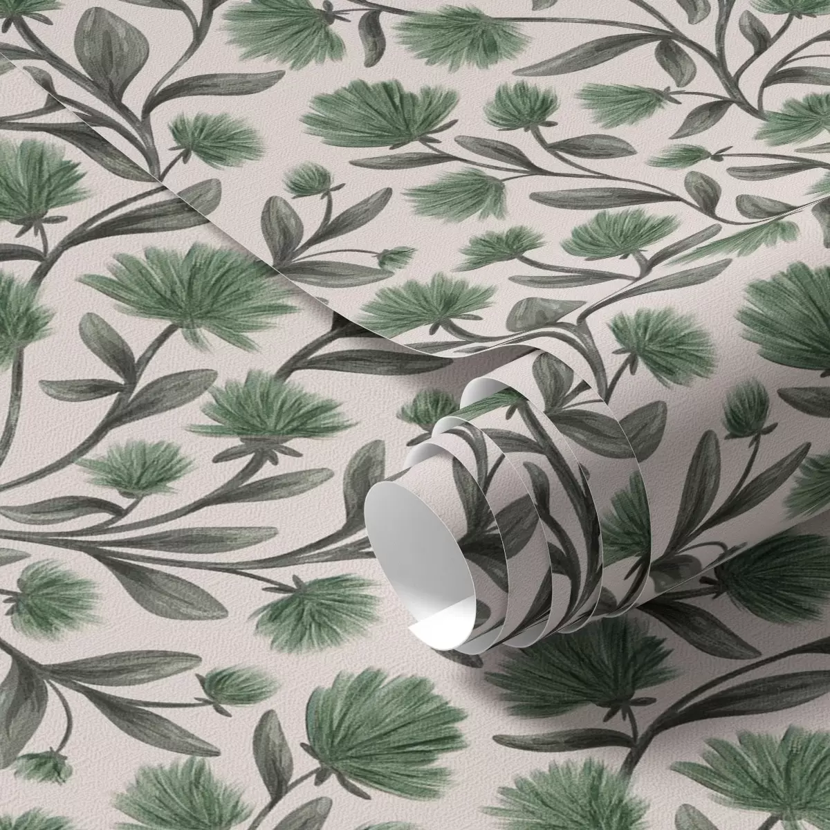 Papel pintado Flores silvestres en una paleta verde sobre fondo crema Nr. a00623v3
