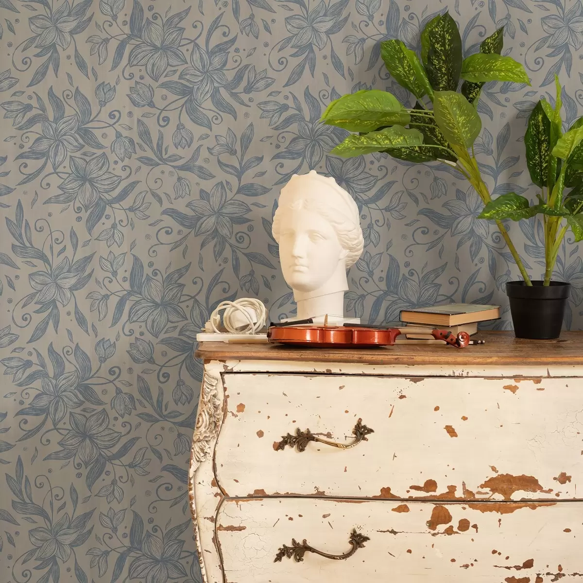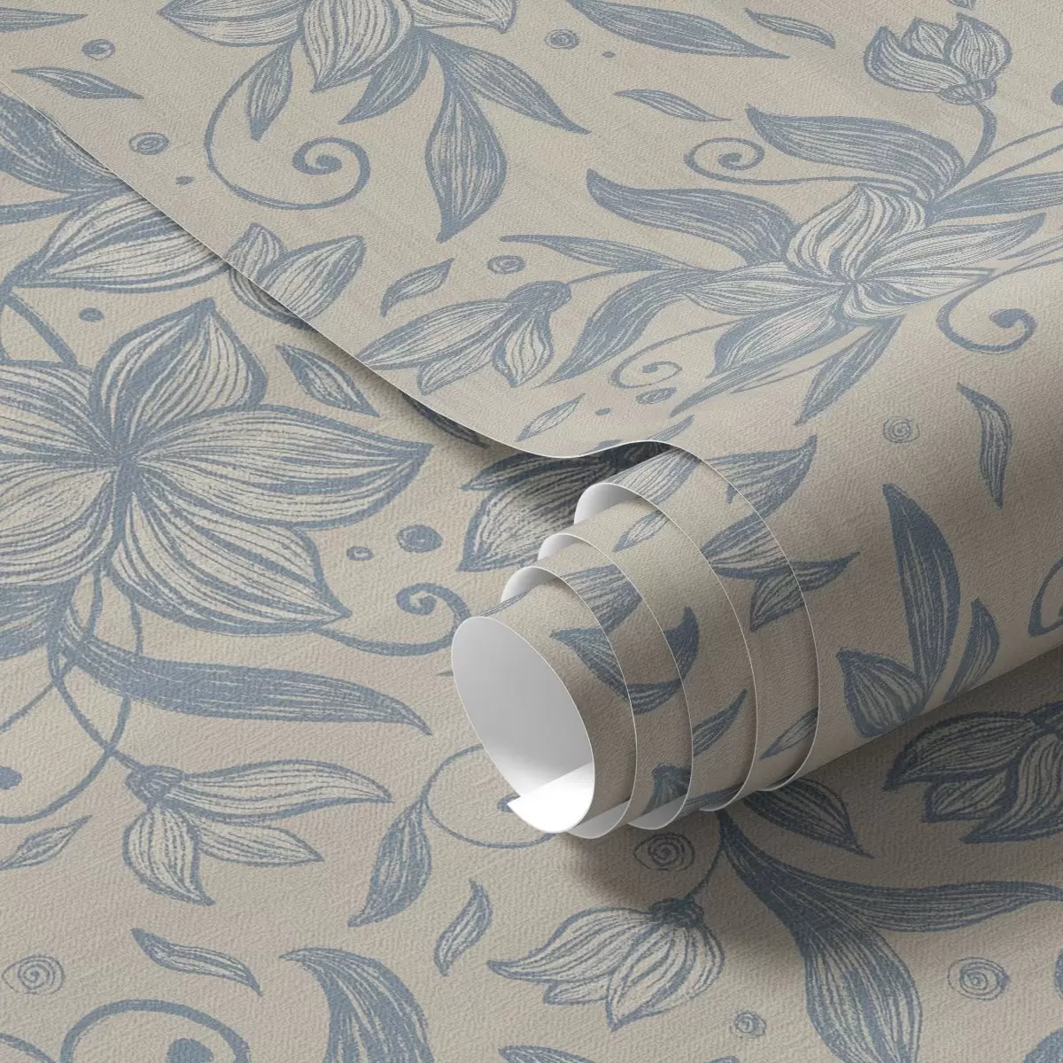 Papel pintado Estampado floral lineal azul sobre fondo beige cálido Nr. a00630v2