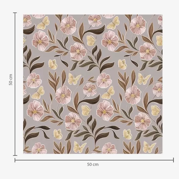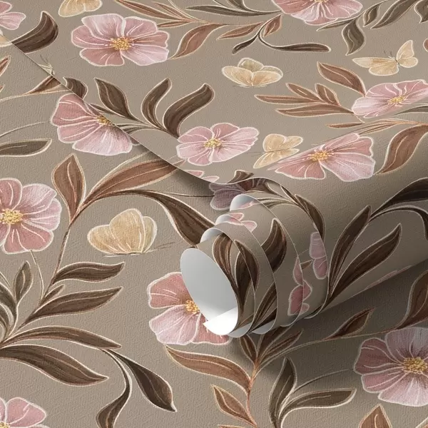 Papel pintado Flores rosas y mariposas sobre fondo beige oliva Nr. a00633v2