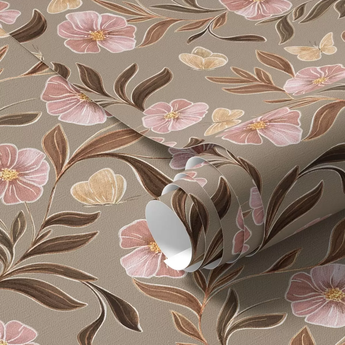 Papel pintado Flores rosas y mariposas sobre fondo beige oliva Nr. a00633v2