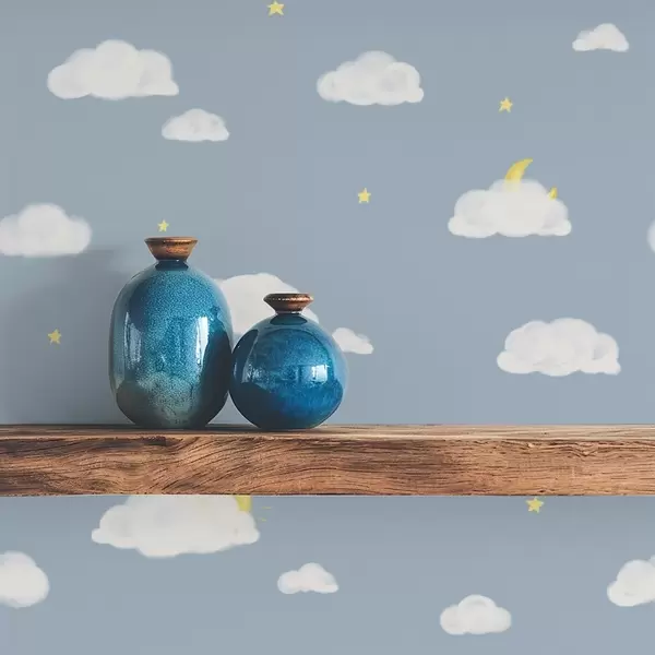 Papel pintado Nubes suaves, estrellas y sol sobre un fondo azul Nr. a00652