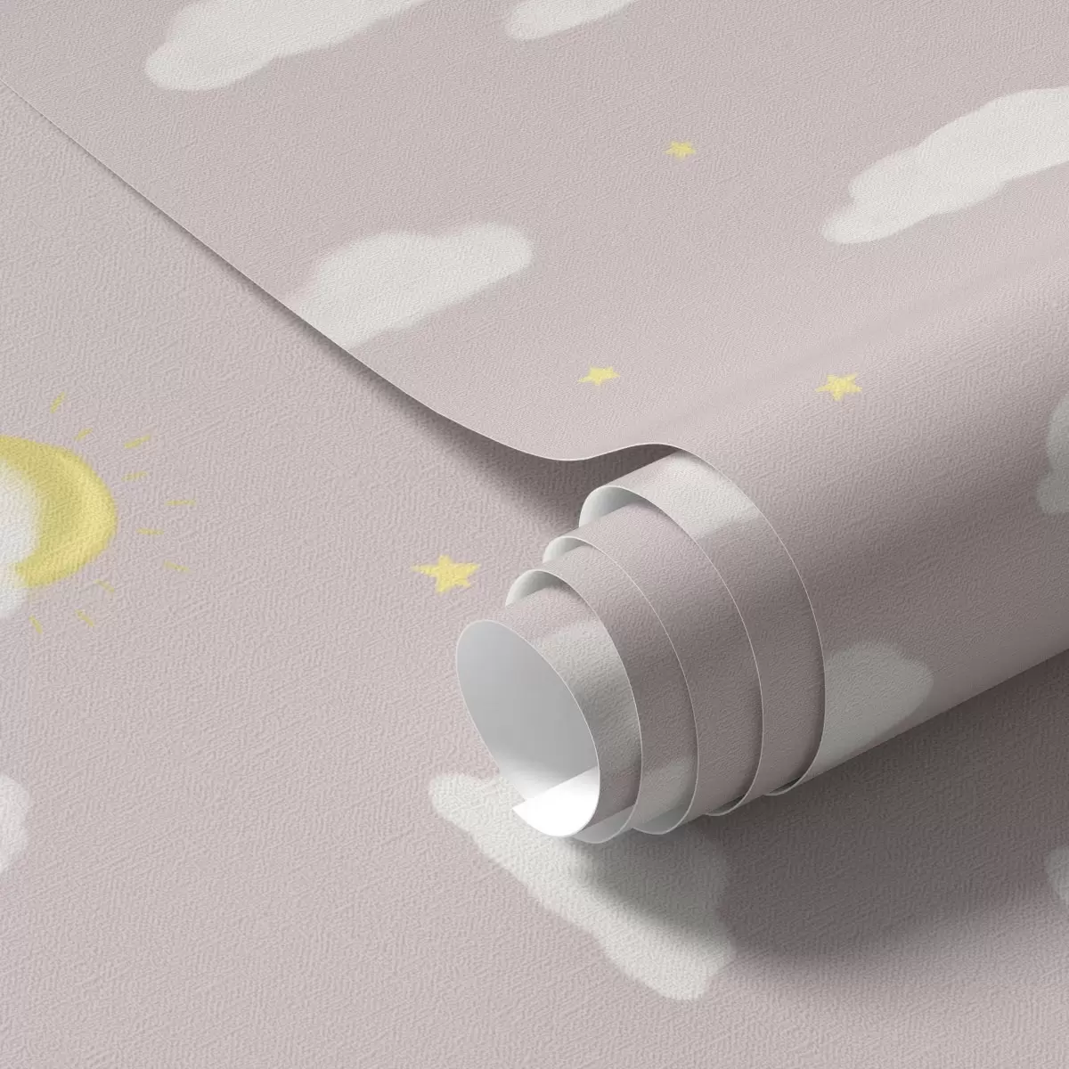 Papel pintado Nubes suaves, estrellas y sol sobre un fondo gris rosáceo Nr. a00652v2
