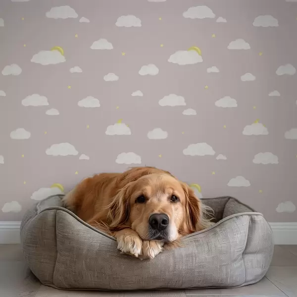 Papel pintado Nubes suaves, estrellas y sol sobre un fondo gris rosáceo Nr. a00652v2