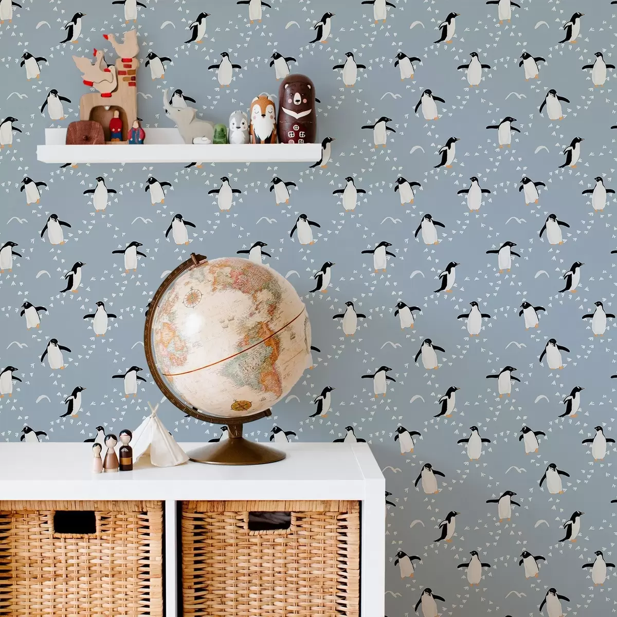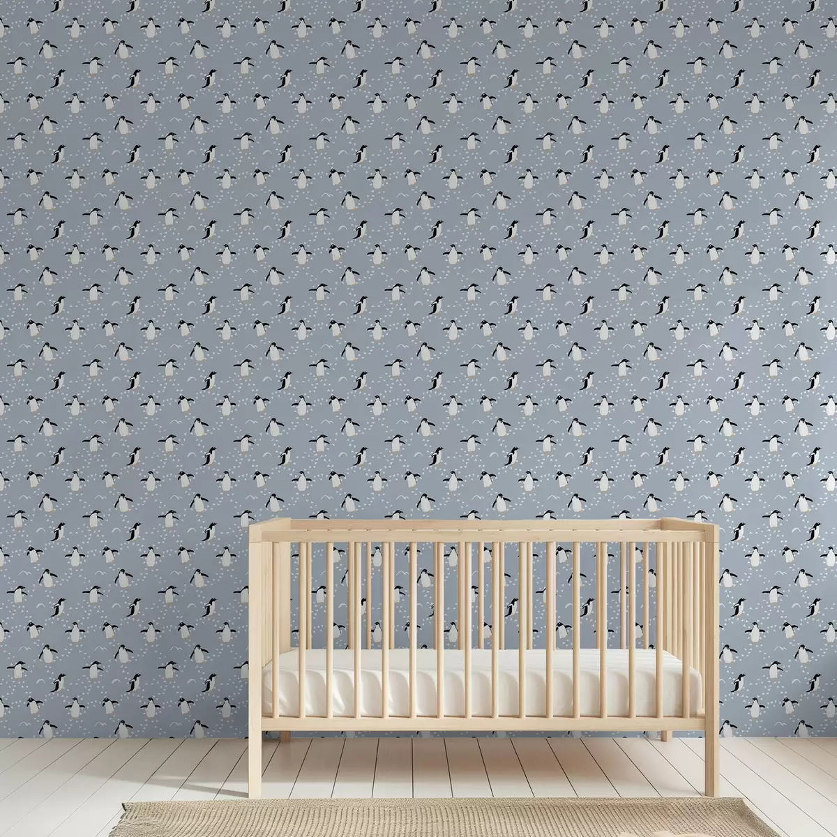 Papel pintado Pingüinos sobre fondo gris azulado con huellas Nr. a00655