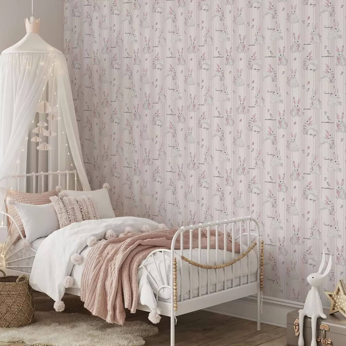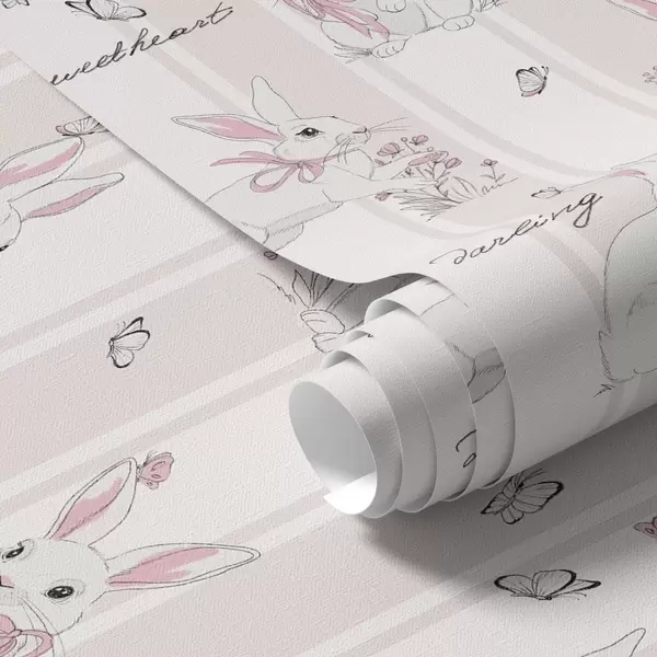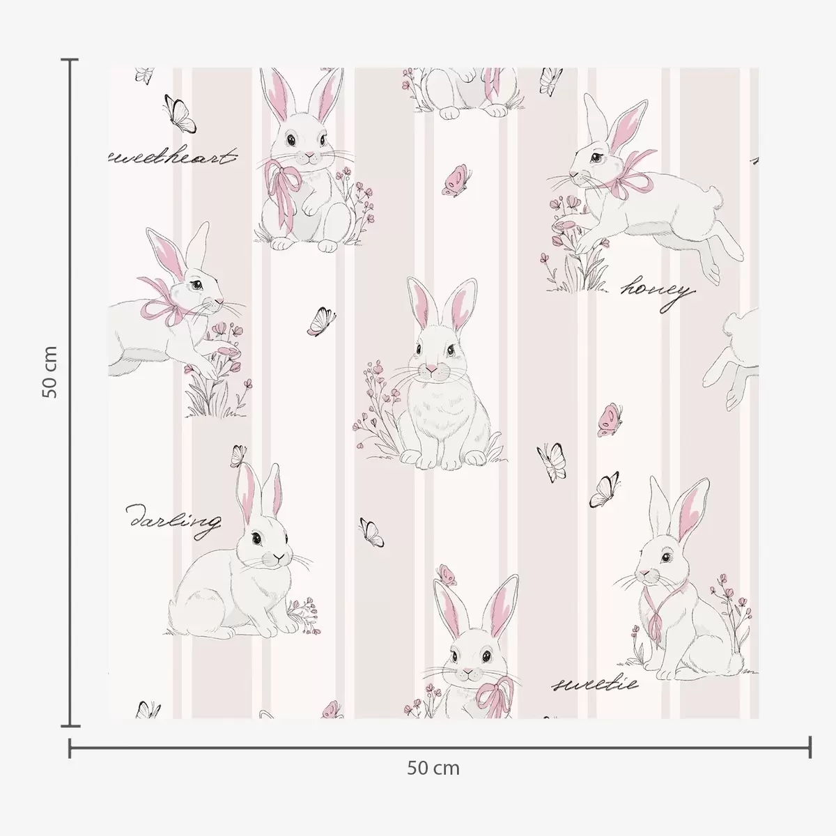 Papel pintado Conejitos con lazos, rayas rosas y pequeñas letras. Nr. a00657