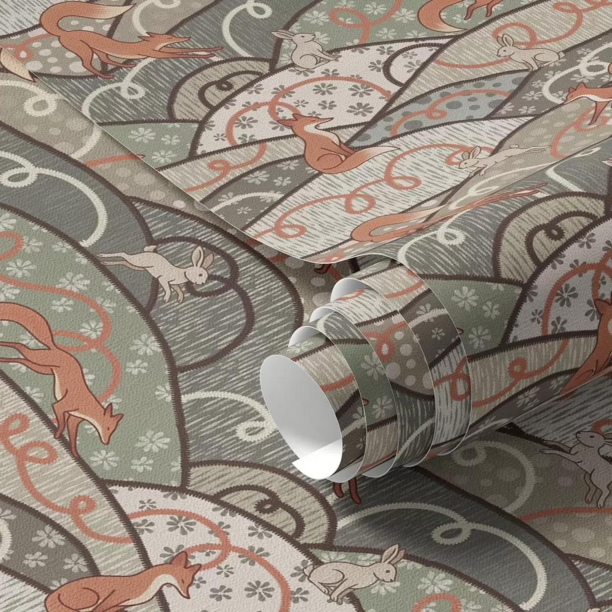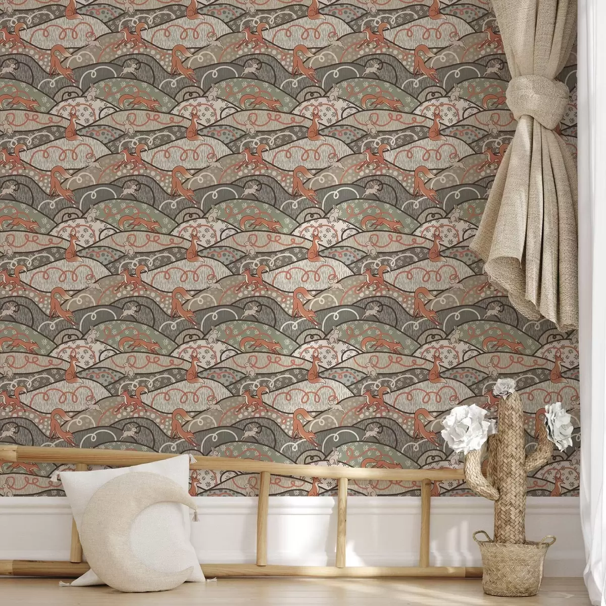 Papel pintado Zorros y liebres en colinas onduladas, diseño retro Nr. a00690