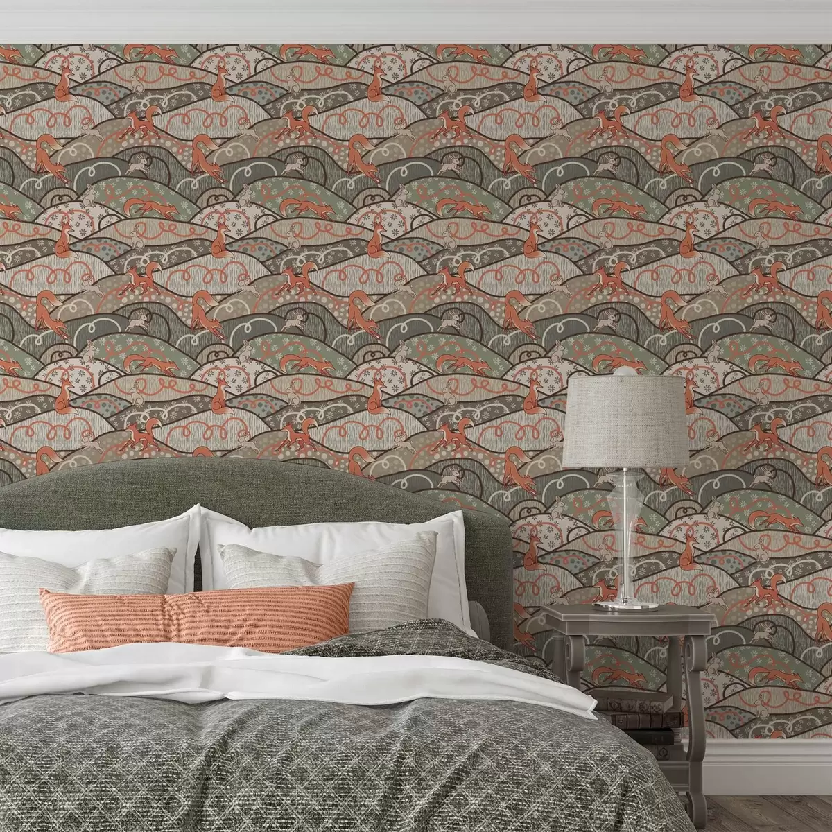 Papel pintado Zorros y liebres en colinas onduladas, diseño retro Nr. a00690