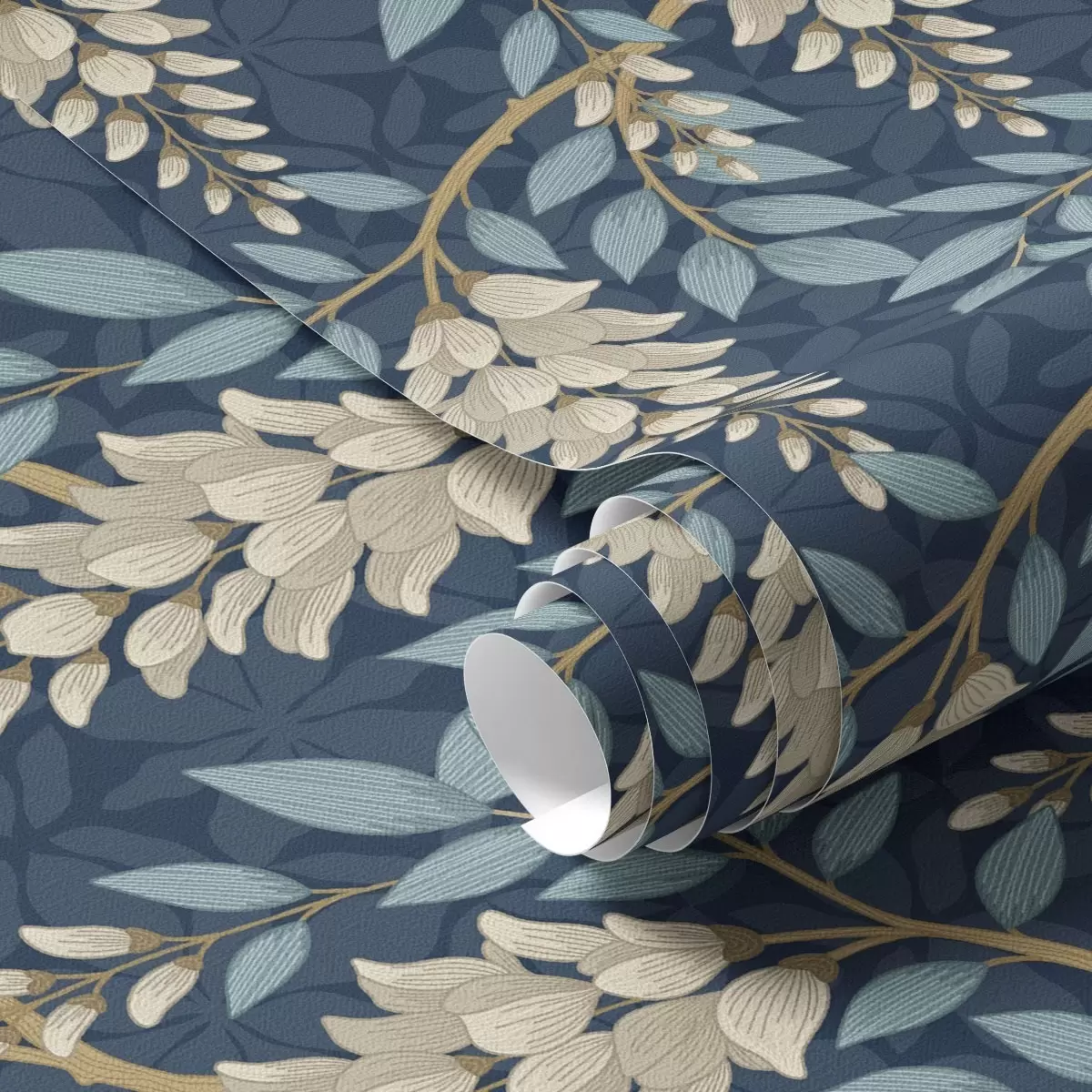 Papel pintado Glicinia con hojas azules sobre fondo azul oscuro Nr. a00694v2