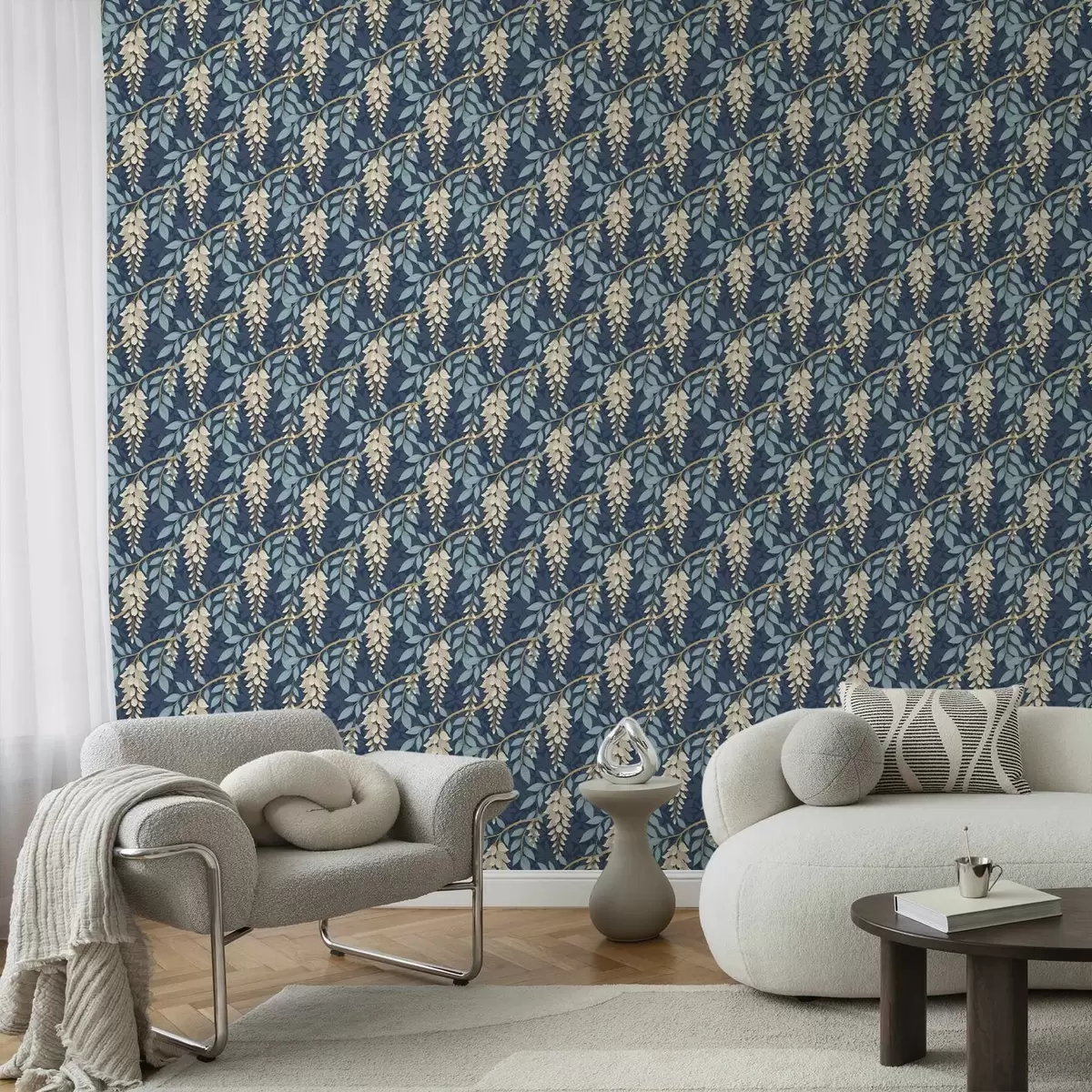 Papel pintado Glicinia con hojas azules sobre fondo azul oscuro Nr. a00694v2