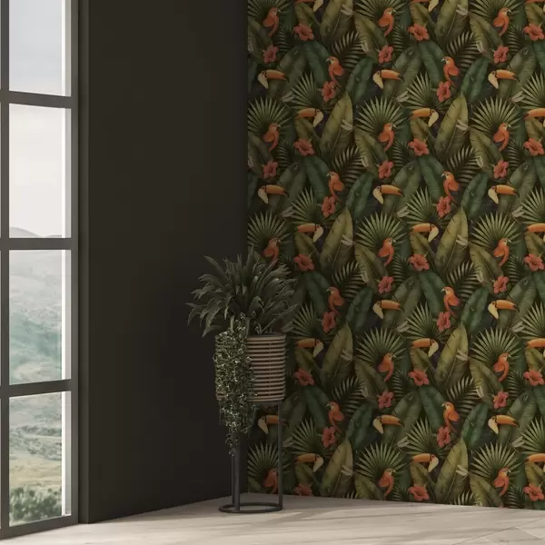 Papel pintado Tucanes y loros entre el follaje y las flores tropicales Nr. a00702